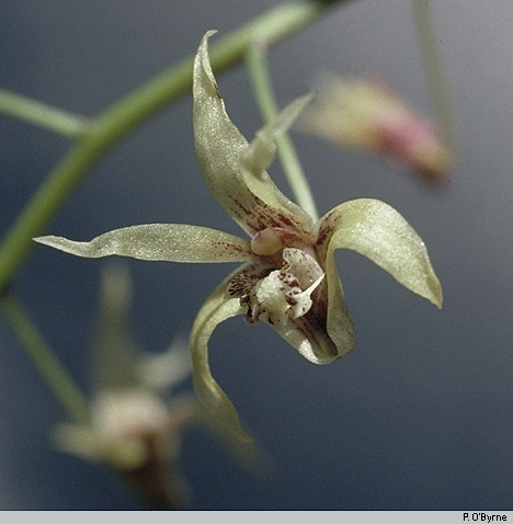 Found in Papua New Guinea in hill forests at elevations of 40 to 900 meters as a small to medium sized, hot to warm growing epiphyte with straight stems carrying linear-terete, pendulous leaves and blooms in the winter and summer on a basal, several flowered inflorescence