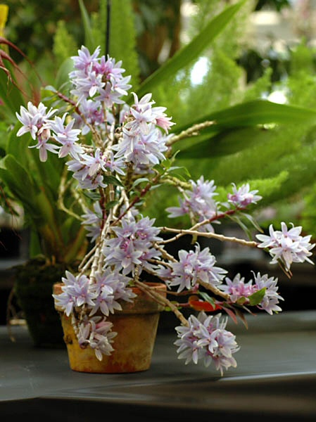 Found in the Phillipines on tree trunkls and branches at elevations above 1300 meters as a small to just medium sized, cool growing epiphyte with slender, pendent, new stems arising from the middle and the base of the previous stem, densely leafy stems carrying many, deciduous, lanceolate, denticulate apically leaves that blooms all along the stem on short inflorescence with 2 to 4 flowers arising on old and new canes and ocurring at most any time of the year.