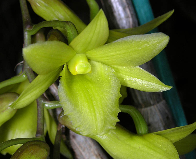 Found in the Philippines, Borneo and Thailand at elevations around 800 meters as a medium sized, warm growing epiphyte with a cylindrical, uprising to semi-pendulous cane carrying semi-deciduous, purple tinged in youth, lanceolate leaves that blooms in the spring on a pendent, to 8 flowered inflorescence arising on leafless stems.