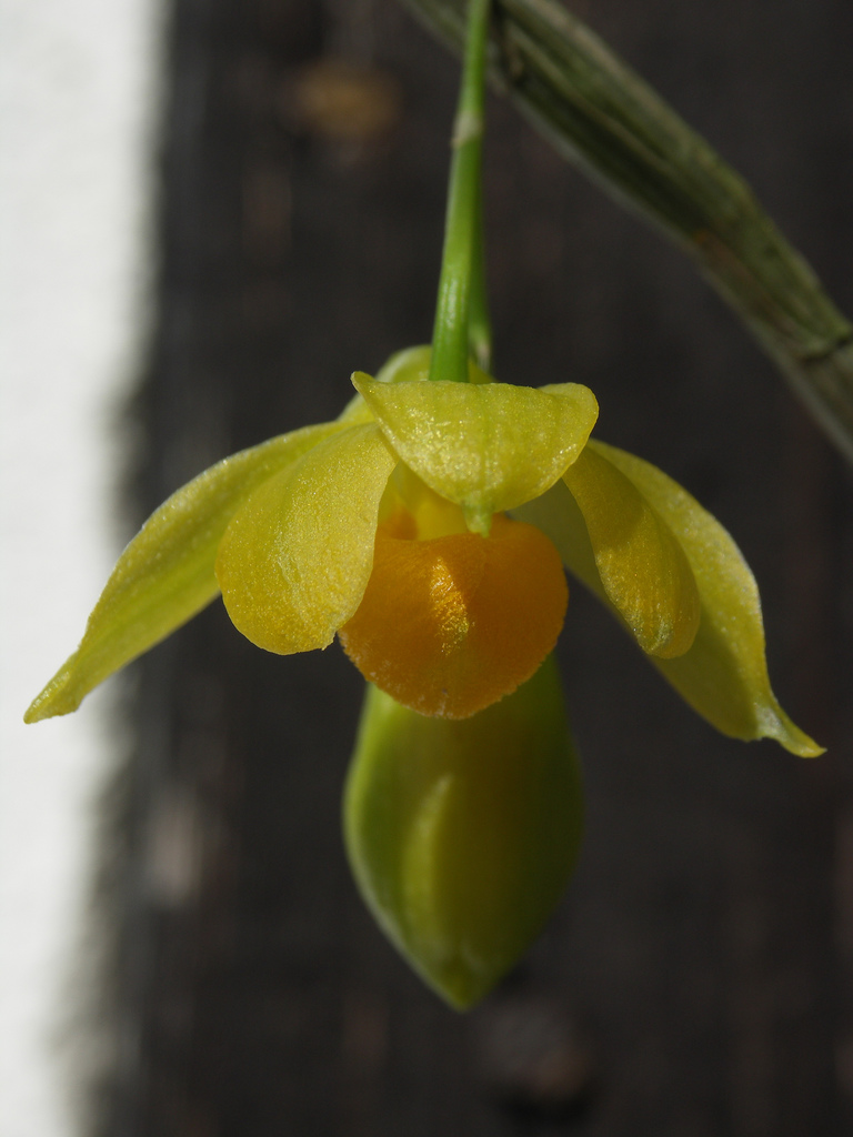 Found in Yunnan province of China, Myanmar and Thailand on limestone at elevations around 1370 meters as a small sized, cool growing lithophyte or rarely epiphyte with basally swollen pseudobulbs carrying 3 +, elliptic-lanceolate, acute leaves that blooms in the spring and summer on a slender, short, single flowered inflorescence carrying short lived flowers