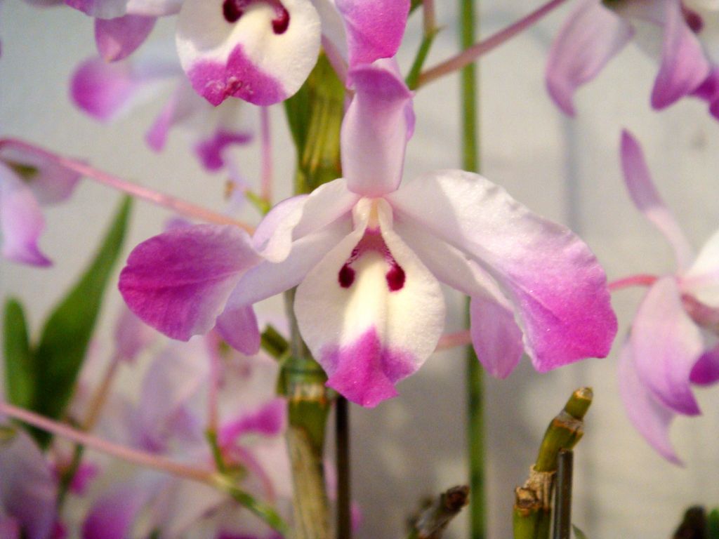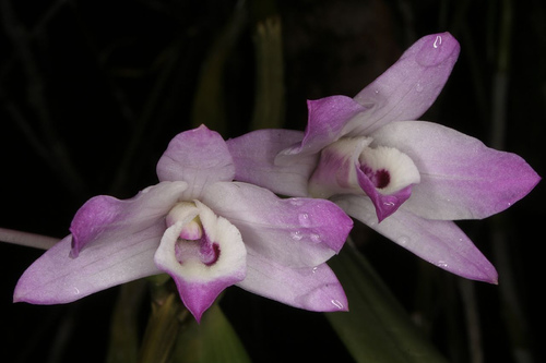 Found in southern China and northern Vietnam as a miniature to small sized, warm to cool growing epiphyte with club-shaped, basally slender, thickening towards the apex, carrying elongate basally clasping leaves that bloom in the spring on a 1.6 to 2.8" [4 to 7 cm] long, laterally from the nodes all along leafless and leafy stems, 2 to 3 flowered inflorescence