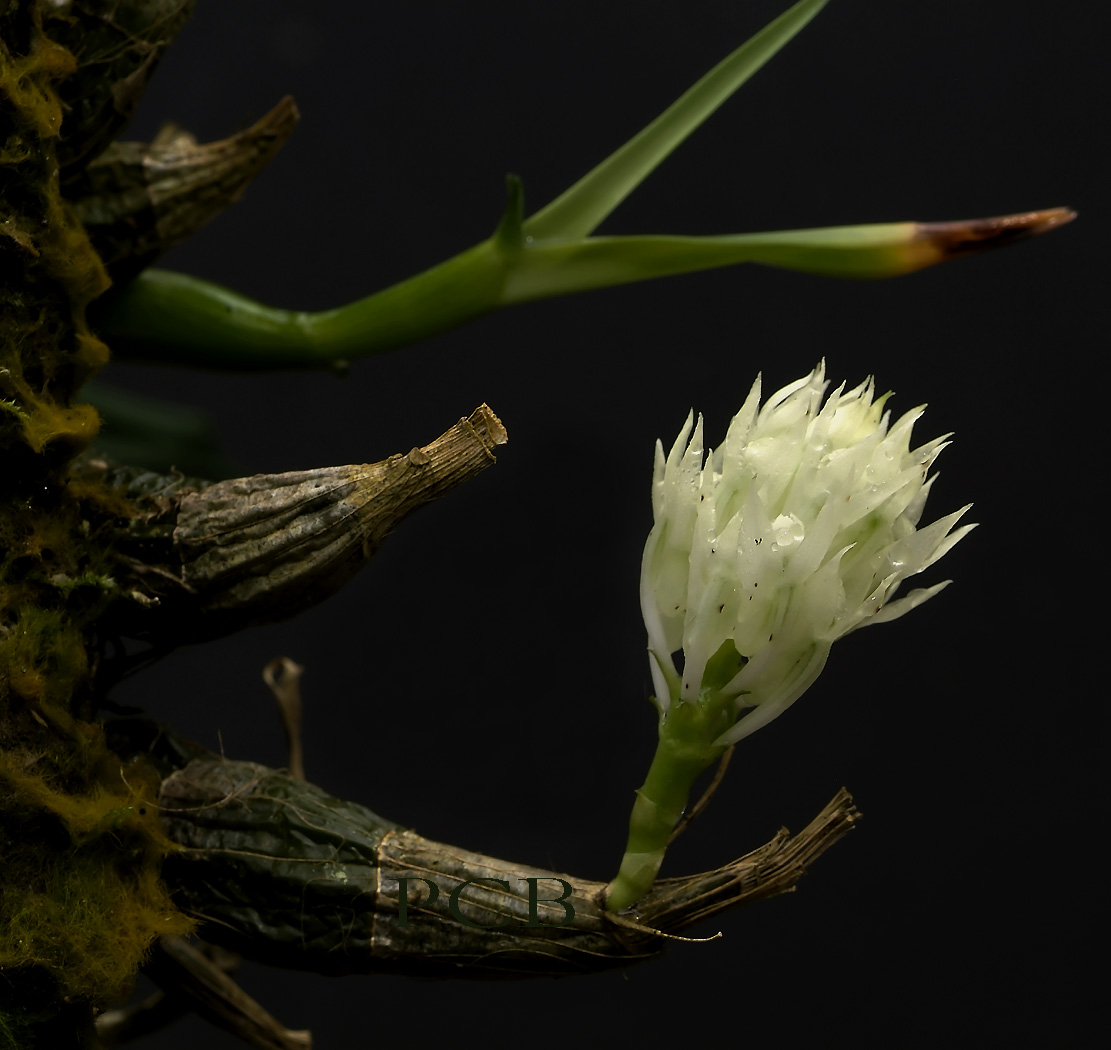 Found in the Bismark Islands and in Papua New Guinea just below the mist forests on mossy trees at elevations around 700 meters as a small sized, warm growing epiphyte with a suberect, cylindrical, leafy stem carrying, erect-patent, ligulate, oblique leaves that blooms in the summer and fall on a 1.2 to 1.4" [3 to 3.5 cm] long, densely many flowered, racemose inflorescence with ovate, apiculate bracts.