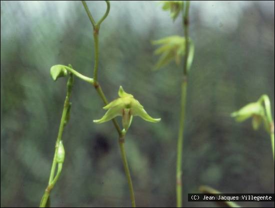 Found in southeastern New Caledonia on small mossy trees at elevations of 700 to 1500 meters as a medium to large sized, warm to cool growing epiphyte or lithophyte with a greenish-yellow, quadrangular stem carrying 9 to 11, in the upper half, short, leathery, linear, deeply and unequally bilobed leaves that blooms in the spring and summer on an erect, 4" [10 cm] long, 3 to 9 flowered inflorescence