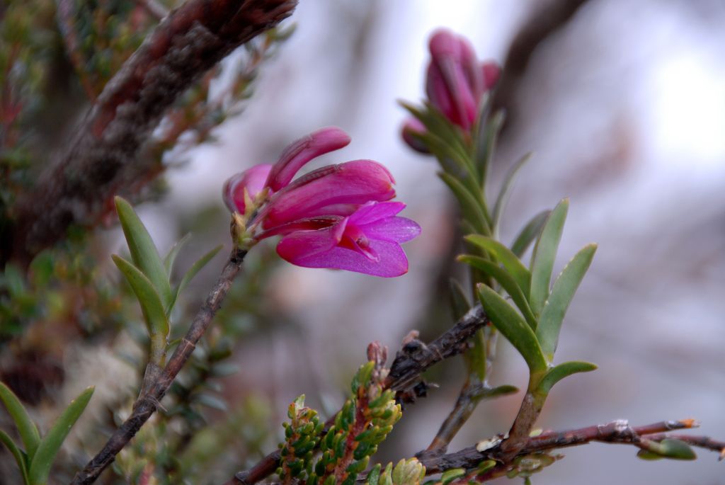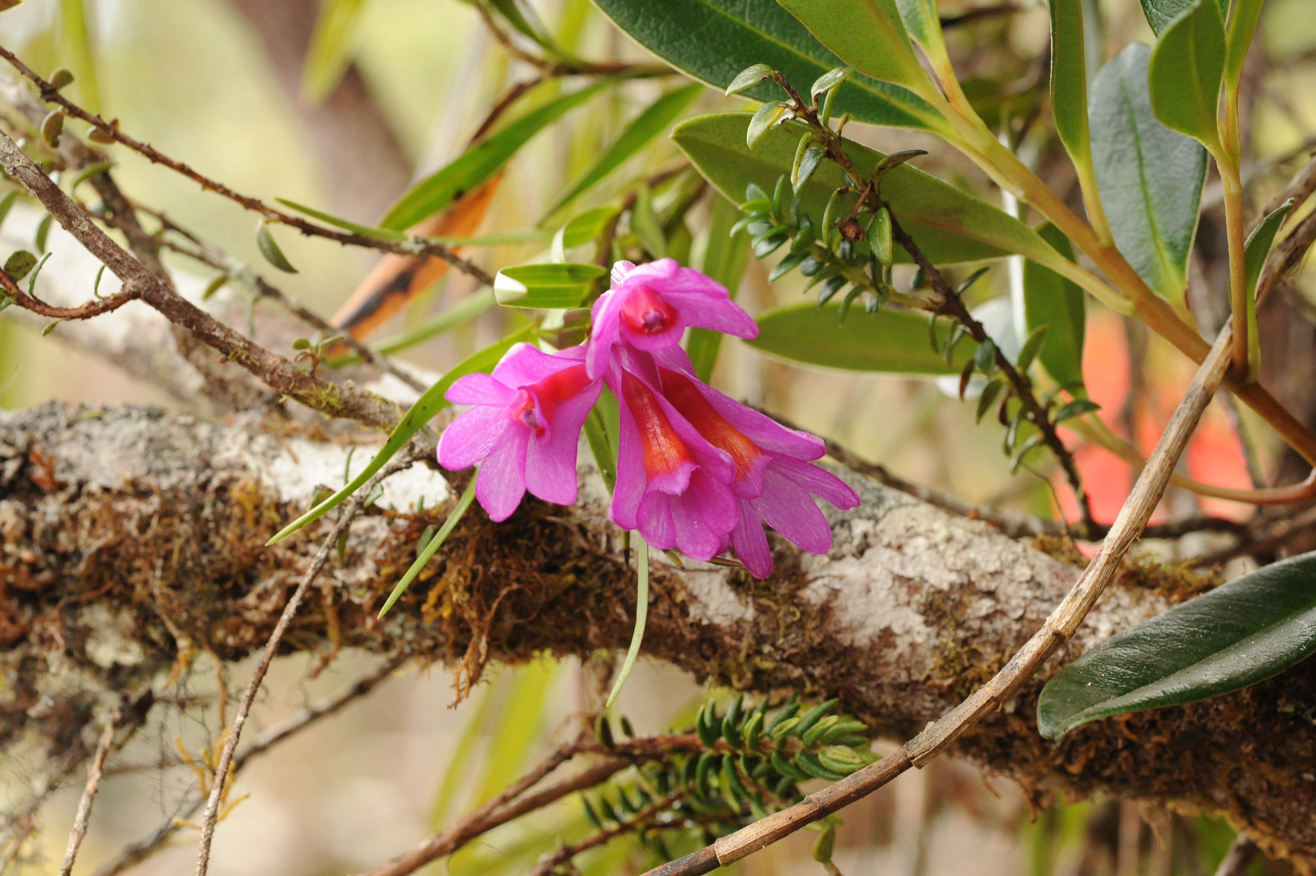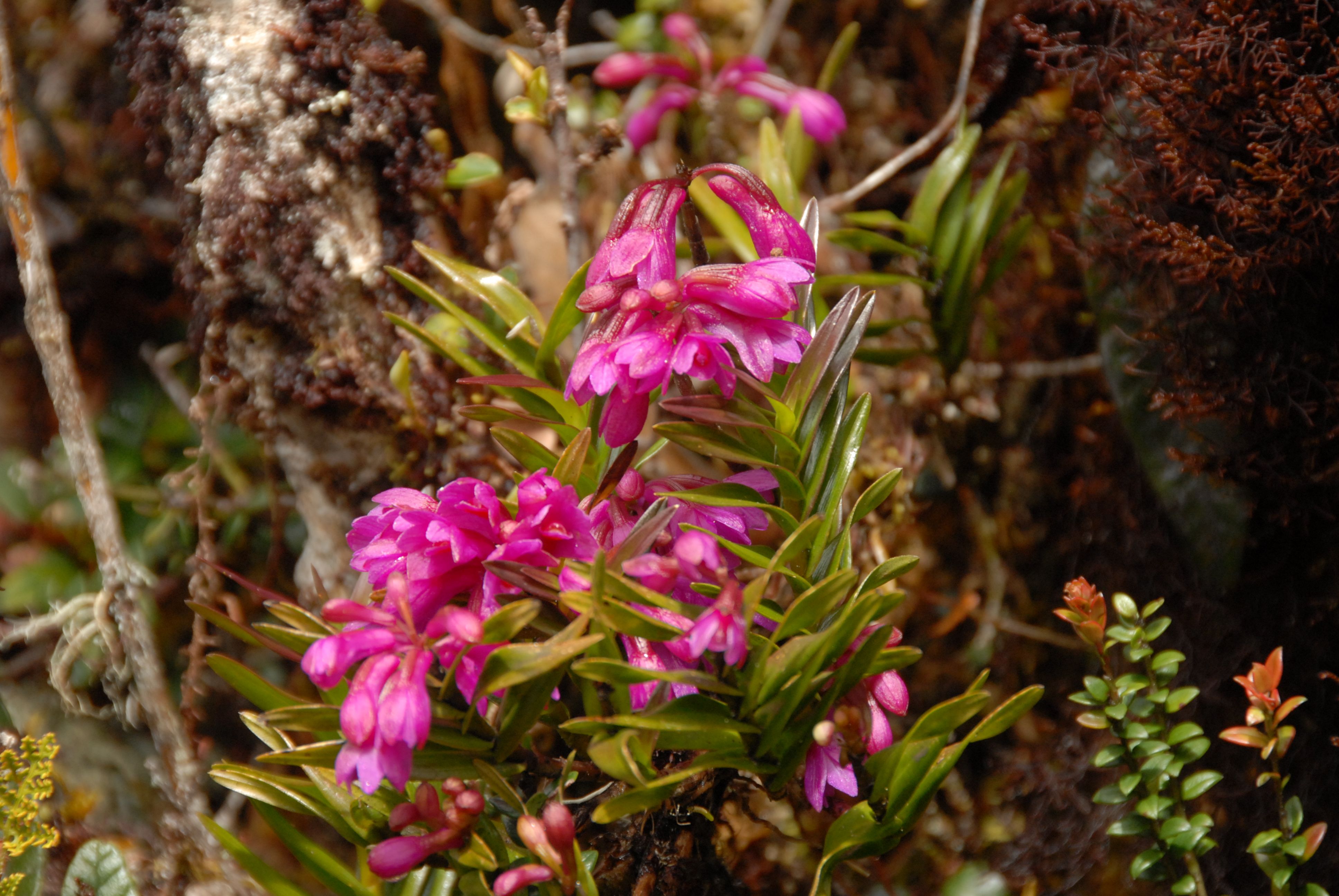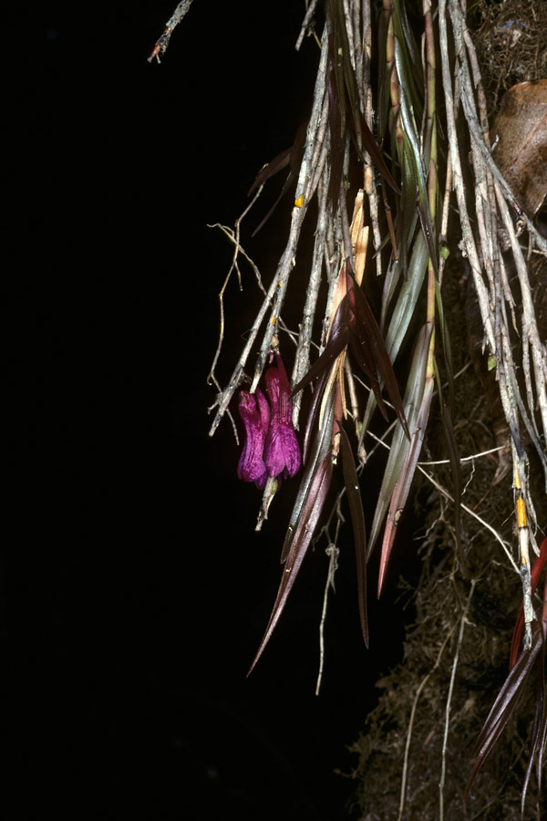 Found only in western New Guinea [Irian Jaya] in alpine grasslands on mossy rocks and shrubs at elevations of 2800 to 3450 meters as a small to medium sized, cold growing terrestrial or occasional epiphyte with slender, erect to pendent, usually branching stems carrying many, lengthwise folded, lanceolate, dark red purple to dark green, crenate margined leaves that blooms at most any time of the year on lateral, short, 1 to 4 flowered inflorescence arising on leafless canes