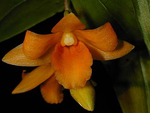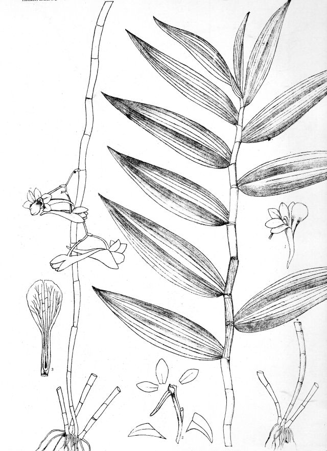 Found in Malaysia and southern Thailand as a lowland, small to large sized, hot growing epiphyte with pendant stems that narrows towards the base carrying many, bright green, lanceolate leaves that blooms on an axillary, 1/2" [1.25 cm] long, few [2 to 3] flowered inflorescence arising laterally on leafless canes with bright orange flowers in the fall.