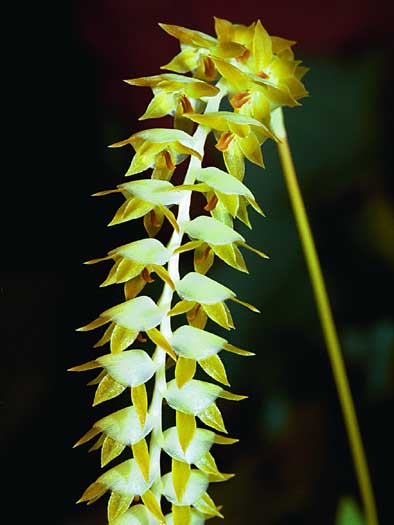This medium sized orchid is endemic to the Philippines at elevations above 1200 meters as a hot to cool growing epiphyte with ovoid pseudobulbs carrying a single, apical, plicate leaf that blooms on a terminal, erect then arching, 2' [60 cm] long, many flowered inflorescence occuring in the spring and summer.