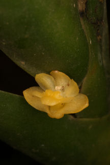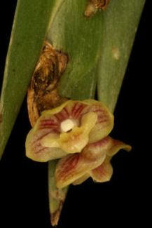 Found in Kalimantan Borneo in ridge hill forests, lower montane forests at elevations of 900 to 1250 meters as a medium sized, warm to cool growing epiphyte with clustered, pendent, narrow, terete to compressed, leafy throughout stems carrying laterally compressed, distichous, imbricate, laterally compressed, lanceolate, obliquely truncate apically leaves that blooms in the late winter and early spring on lateral, emerging among the fasiculate chaffy bracts, short, single flowered inflorescence.
