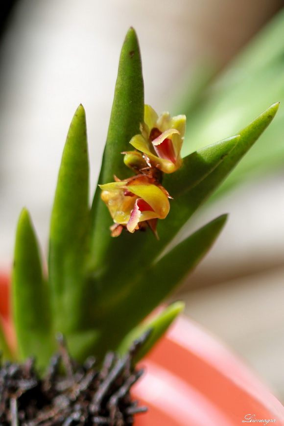 Found in [Sumatra?] Ambon Island of the Moluccas at elevations around 650 meters as a small sized warm growing epiphyte with freely branching, flattened, thin basally, thickening towards the apex stems carrying close set, imbricate, flattened, triangular leaves that blooms in the late fall and winter on an axillary and terminal, nodding inflorescence carrying fleshy flowers.