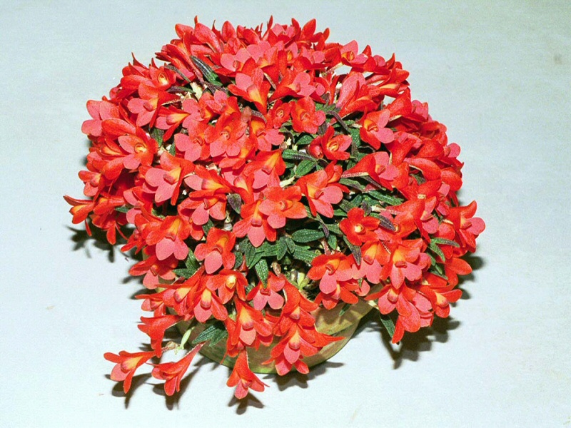 This is a high altitude [750m-3500m] mossy tree growing, miniature epiphyte or growing as a lithophyte on mossy rocks by streams or a east face terrestrial cliff dweller that is in leaf litter and beneath small plants in very exposed sun conditions with clustered, very short, fusiform stems carrying lanceolate, rough textured, dark green, purple veined below leaves. This plant is found in New Guinea and is free-flowering with a solitary flower on a terminal to axillary, short, single flowered inflorescence if given cool to cold conditions with high humidity and great airflow, even year round watering and a steady weekly fertilizing.