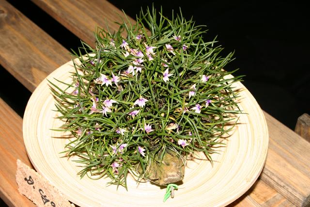 Found in the mountains of New Guinea as a mini-miniature sized, hot to cool growing epiphyte in rainforests, forest clearings and river banks at elevations of 100 to 1600 meters with erect to semi-pendent, ovoid to cylindrical to fusiform pseudobulbs carrying 2 to 4, distichous, apical, slender, rough, twisted, purple beneath, conduplicate, semi-glossy, linear-ligulate, acute, acuminate, leaves that blooms in the late winter and spring on a terminal, short inflorescence often hidden within the leaves but arising on leafy and leaflesss canes with a single, rarely 2, star-shaped, lightly fragrant flowers.