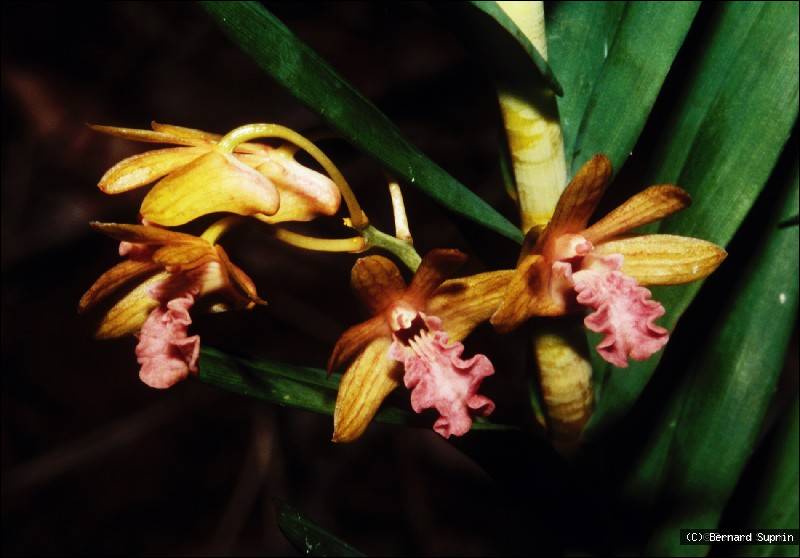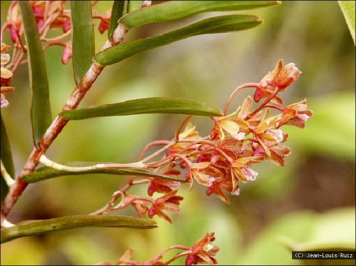Found in southern New Caledonia in strand forests and serpentine bland at elevations of 50 to 750 meters as a giant sized, hot to warm growing terrestrial with bamboo-like, slender stems carrying short, pinkish green to grey blue, linear-ligulate, obtuse, unequally bilobed apically leaves that blooms in the winter and spring on lateral, several flowered inflorescence.