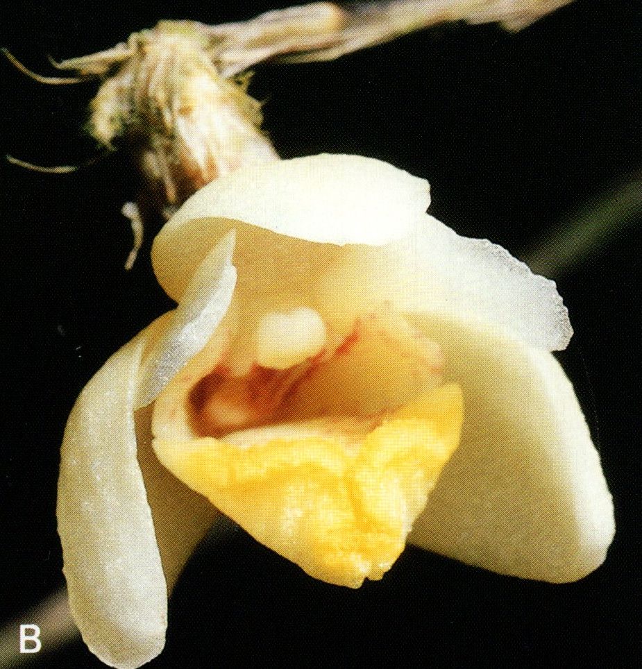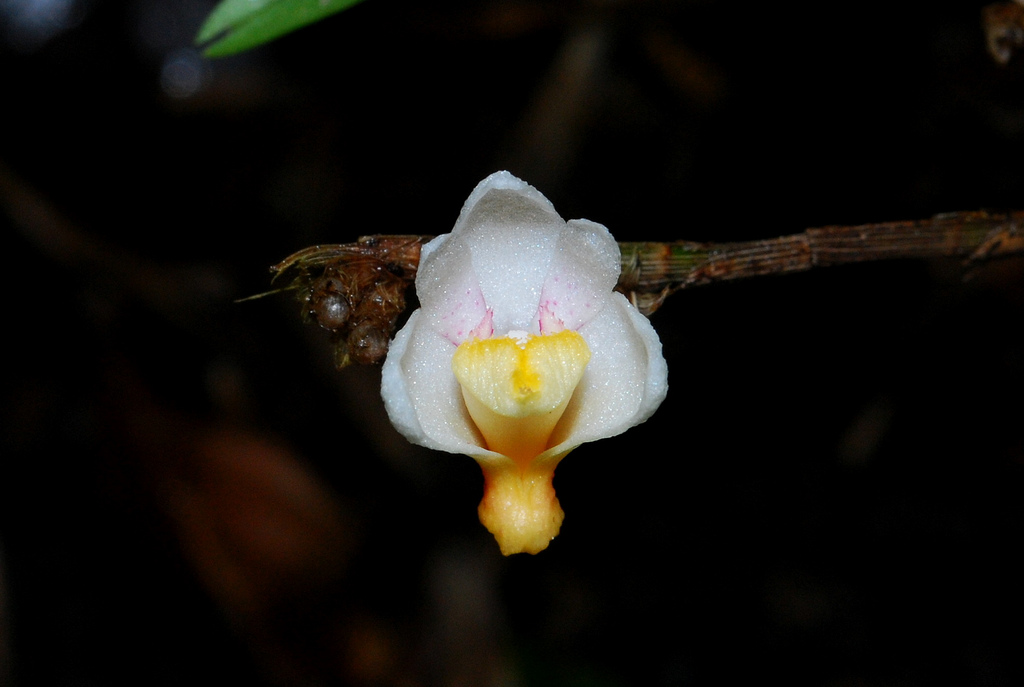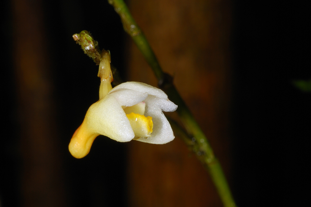 Found in Borneo in hill, lower and upper montane forests at elevations of 700 to 2400 meters as a medium sized, warm to cold growing epiphyte with swollen above the base, many angled, branching stems carrying many, papery, linear-lanceolate, folded, slightly basally twisted, acuminately bidentate apically leaves that blooms in the spring on a short, few flowered inflorescence