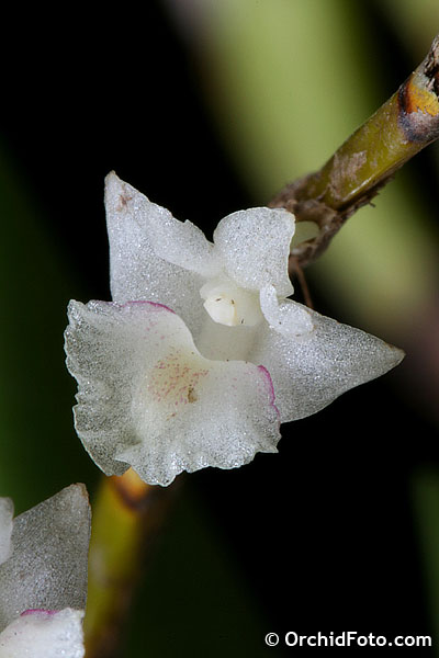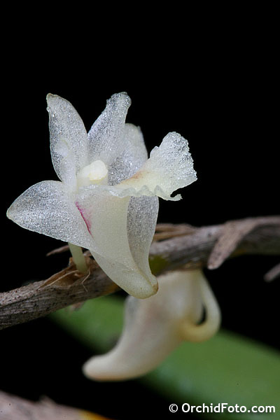 Found in the Assam, eastern Himalayas, Hainan China, south central China, Malaysia, Laos, Cambodia, Vietnam and the Moluccas in broadleaf evergreen lowland forests at altitudes of 500 to 2200 meters as a small to just medium sized, warm to cold growing epiphyte with tightly clustered, slightly zigzag, slender stems carrying 8 to 12, narrow, pointed, distichous, succulent, curved leaves that are folded which blooms on an axillary, at the upper nodes of a leafless pseudobulb, single flowered inflorescence occuring in the spring.