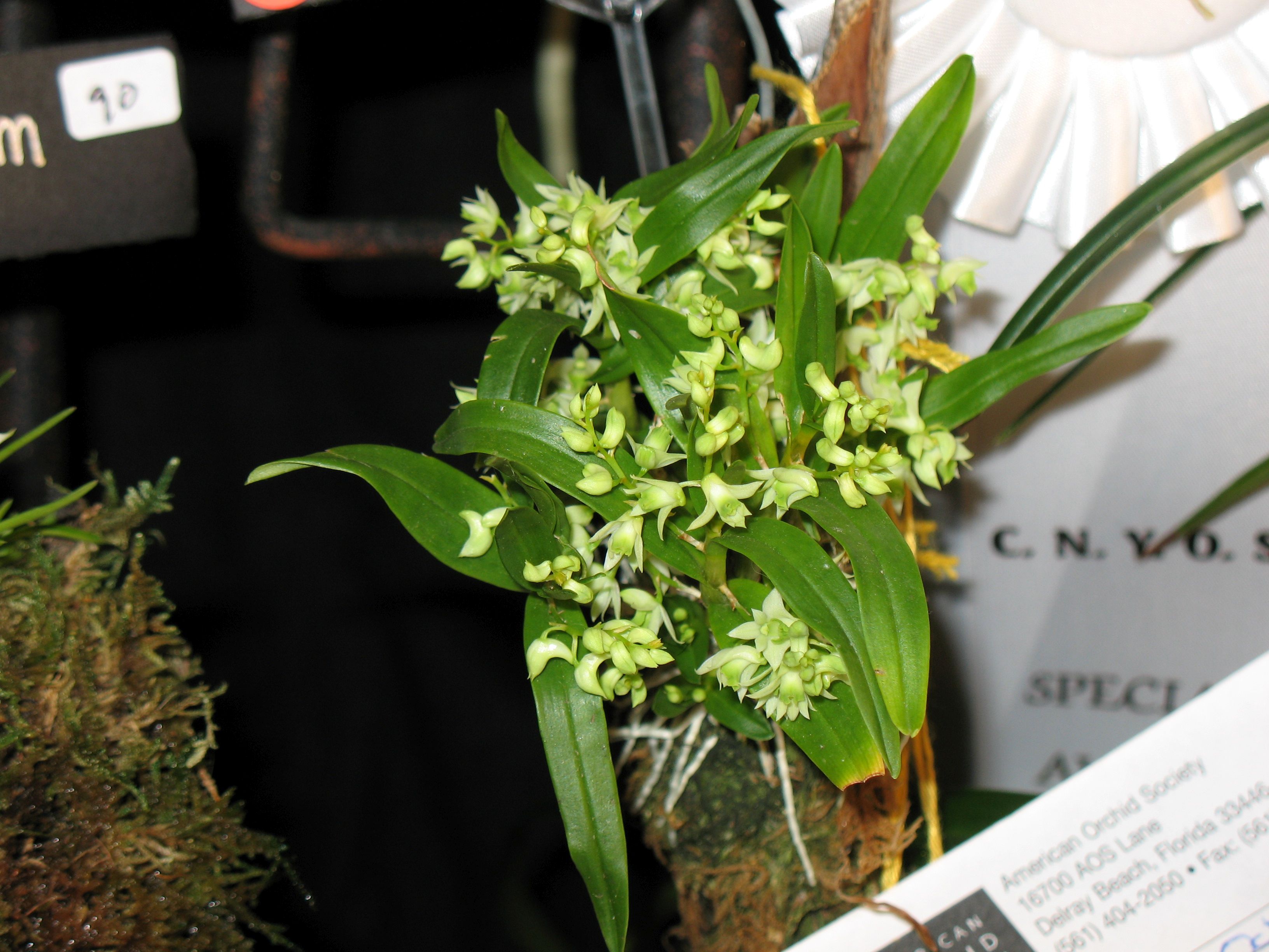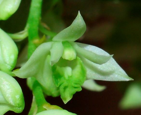 Found in Darjeeling India and Nepal at elevations around 2000 meters as a mini-miniature sized, cool to cold growing epiphyte with erect stems carrying 3 to 5, deciduous, obtuse to acute, shortly bilobed, pale green leaves that blooms in the winter on an erect, 1.6" [4 cm] long, 4 to 6 flowered inflorescence with acute to acuminate floral bracts.