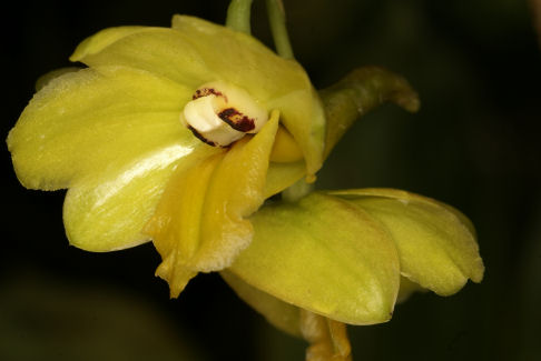 Found in Sabah Borneo probably in hill or lower montane forests at elevations of 500 to 800 meters as a large sized, warm growing epiphyte with 6 or so clustered stems carrying a few towards the apex, narrowly elliptic, slightly oblique, acute to acuminate apically, shortly attenuate and cuneate basally leaves that blooms in the winter? on a purple, .8 to 1" [2 to 2.5 cm] long 3 to 5 flowered inflorescence arising on the apical portion of a leafless stem with ovate, acute, translucent, purple spotted floral bracts.