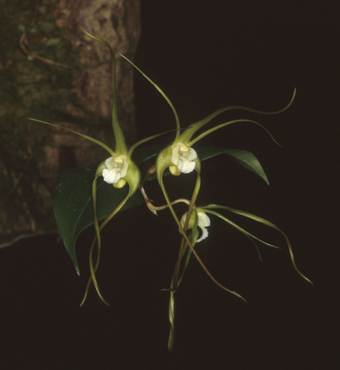 This medium sized, warm to cool growing epiphytic or lithophytic species comes from Queensland Australia at elevations from sealevel to 1600 meters but most often above 900 meters where it is found low on trees and occasionally it can be found on rocks. Regular watering should be made in the summer through late autumn when a lessening of water and fertilizer should occur, but never allow the medium to dry out completely. Mounting is the prefered method of cultivation so as to accomodate the pendant growth habit. It has a greenish brown, pendant stem that is wiry basally and gradually becomes 4 angled and carries 2 to 4, dark green, ovate, thin leaves that blooms on a slender, axillary, 8" [20 cm] long, few [2 to 5] flowered, racemose inflorescence occuring in the winter and early spring with flowers that are quite fragrant.
