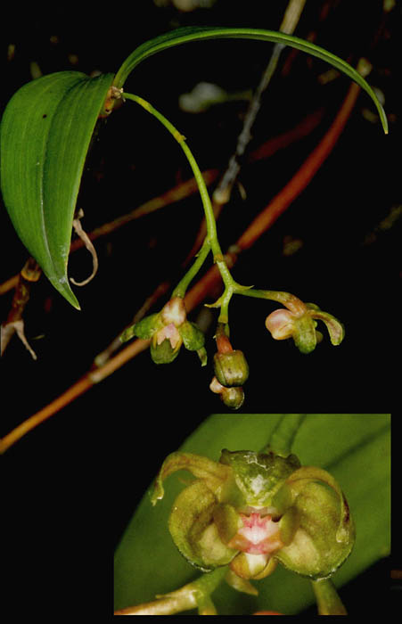 This small to medium sized, cool to cold growing epiphyte is found in western New Guinea at altitudes of 1800 to 3100 meters in open forests on mountain ridges in heathlike areas with orange to red brown, 3 to 5 noded stems carrying 2 to 3, elliptic-lanceolate leaves and blooms in the fall on a 2 to 3" [5 to 7.5 cm] long, axillary, suberect, several [to 8] flowered inflorescence that arises from near the apex of the cane with fleshy flowers that do not open well.