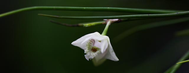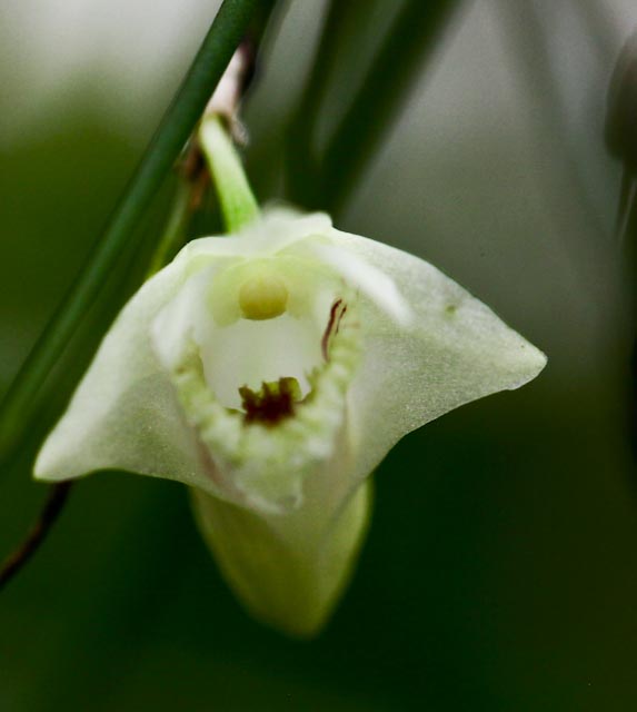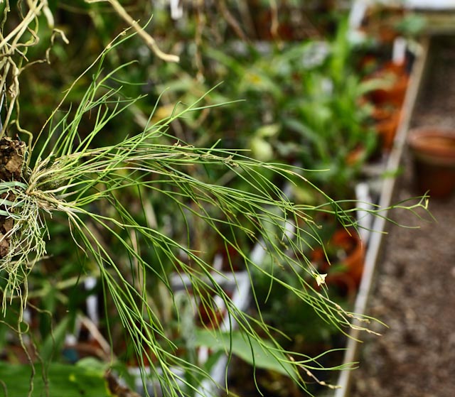 Found in Vietnam as a medium sized, warm to cool growing epiphyte with clustered, ocasionally branching, shortly swelling above the base to a pseudobulbous stem, straight, thin above stem carrying many, terete leaves that blooms in the winter on up to several, along the upper part of the leafless stem, from tufts of small bracts, single flowered inflorescence.