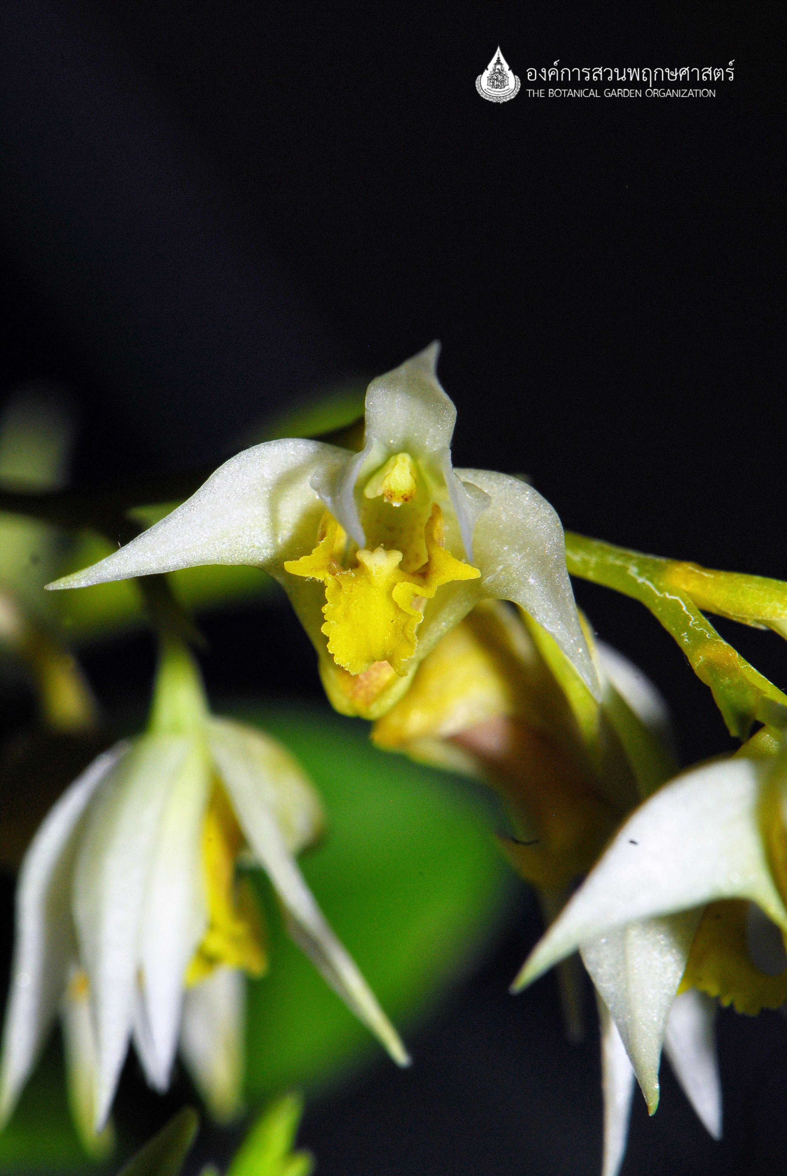 Endemic to northeastern Thailand at elevations of 1650 to 1800 meters as a miniature sized, cool growing epiphytic orchid that has tightly clustered stems carrying 4 leaves and blooms in the mid summer on axillary, 1.2 to 2" [3 to 5 cm] long, few to several [5 to 13] flowered inflorescence that arise from the nodes at the apex of the leafless cane with flowers that do not open fully and needs a short drier winter rest.