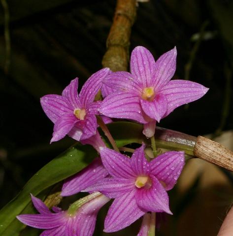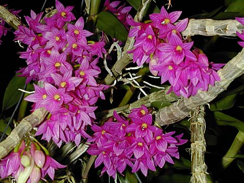 A medium to large sized, hot to warm growing, low altitude epipyhte found most often in ficus trees in the banyan jungles of Taiwan and the Philippines below the altitude of 300 meters with clustered, unbranched, cane-like stems carrying many, deciduous, lenear-lanceolate, pointed leaves. The bloom season is in the late winter and early spring and a secondary bloom through the summer and fall on a short, fasciculate, racemose, few to several flowered inflorescence that arises from the nodes along the older leafless cane with 4 to 8, small flowers in a cluster. They need a slight lessening of water and a cessation of fertilizer through the winter months and resuming with the onset of spring and prefer a semishaded situation. Cited as a synonym, by Jim Cootes in Orchids of the Philippines, of D goldschmidtianum and I feel that it is correct. Only difference that I can see is that D miyakei is said to be scentless and D goldschmidtianum is scented.