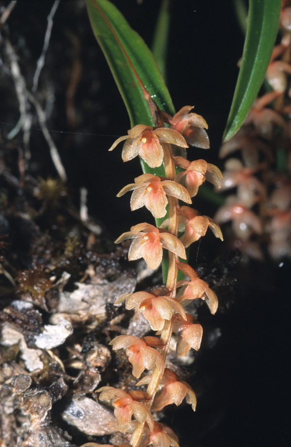 Found in Borneo near Mt Kinabalu in upper montane forests at elevations above 900 to 3800 meters as a small sized, to cold growing epiphyte with small ovoid, minutely wrinkled, orange red pseudobulbs carrying a single, apical, linear, acute, gradually narrowing below into the petiolate base leaf that blooms at most any time of the year on a terminal, erect, 4" [10 cm] long, many flowered inflorescence.