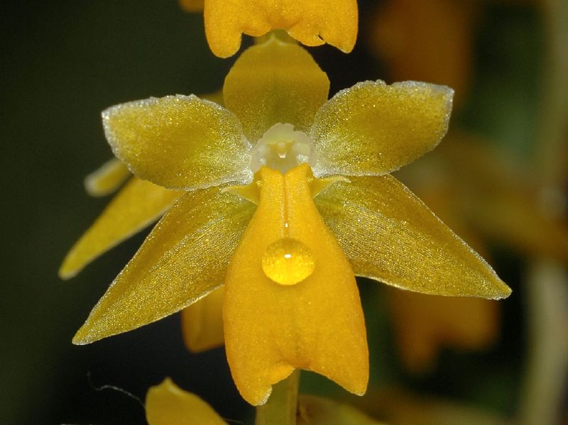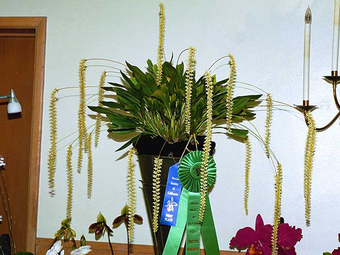 An epiphytic, small sized, cool growing, Philippine species occuring, on mossy tree trunks or as a lithophyte on rocks in full sun, at elevations above 1200 meters with clustered, narrowly conical, yellowish pseudobulbs carrying, a single, apical, oblong-lanceolate, acute, petiolate leaf with a prominent mid rib that blooms in the spring and fall with a sharply pendant, 20" [50 cm] long, ovate bracteate inflorescence with ovate, subacute, glumaceous bracts and many fragrant vanilla scented flowers.