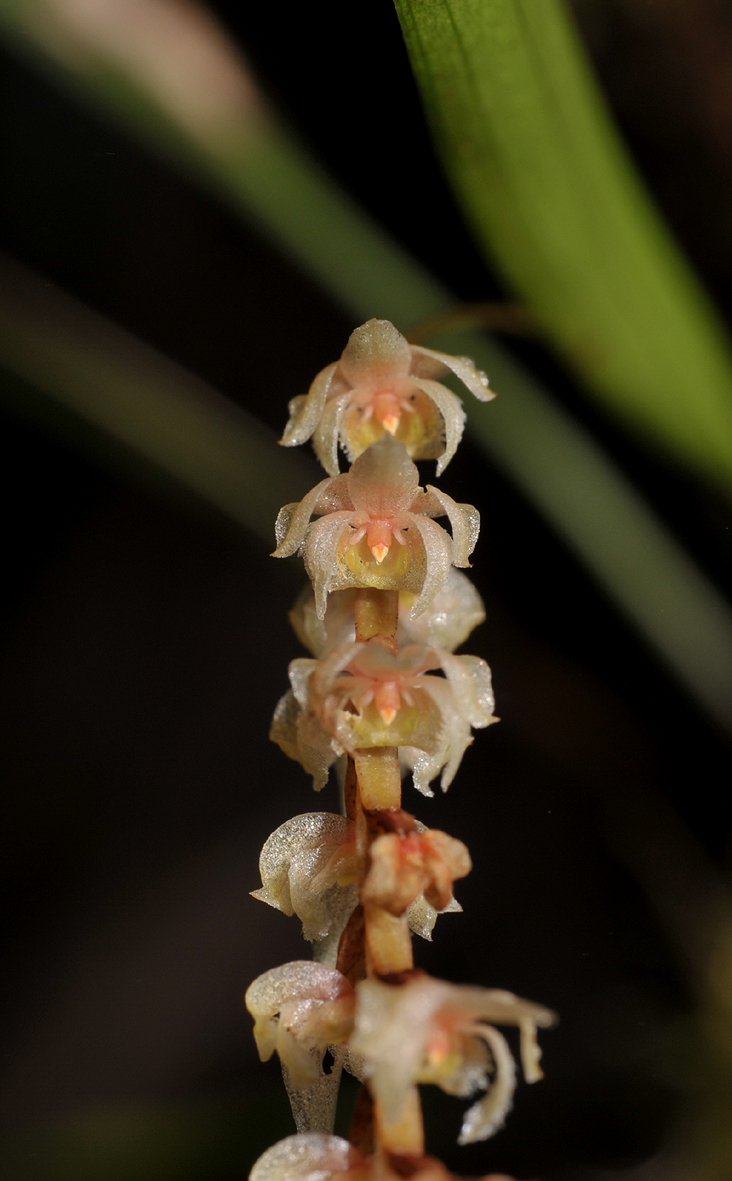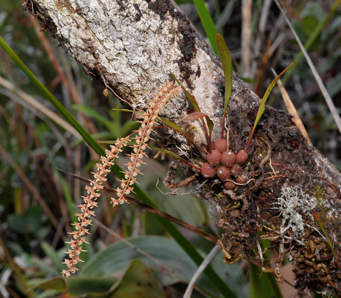 Found in Sabah Borneo in lower montane forests at elevations of 1500 to 2100 meters as a miniature sized, cool to cold growing twig epiphyte and sometime lithophyte with clustered, ovoid-globose to broadly ellipsoid, rugulaose, green suffused with red to entirely red pseudobulbs carrying a single, apical, erect, coriaceous, linear to linear-lanceolate, acute, minutely apiculate, rigid, sulcate along the middle, dark olive green, 3 to 4 nerved, gradually narrowing below into the elongate, petiolate base leaf that blooms in the spring, again in the later summer and fall on a basal, erect then arching, terete, filiform, 4 to 10.8" [10 to 26 cm] long, overall, rachis to [5 to 16 cm] long, quadrangular, reddish, subdense to densely many flowered inflorescence with ovate-elliptic, acute bracts and broadly ovate, subacute floral bracts.