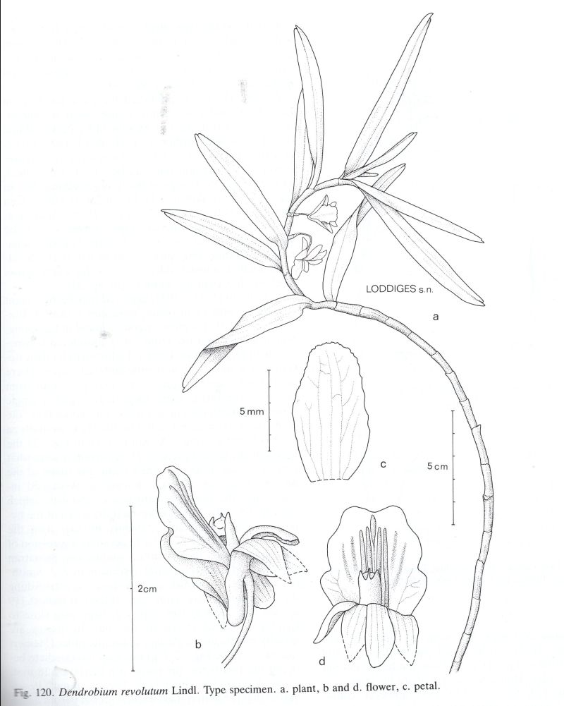 References W3 Tropicos, Kew Monocot list , IPNI ; Orchids of Burma Grant 1895/1995; Flora of Malaya Vol 1 Orchids Holttum 1953; The Orchids of Thailand Seidenfaden & Smitnand 1960 drawing not = D ellipsophyllum; The Orchids of Thailand Seidenfaden & Smitinand 1965 corrections = D ellipsophyllum; Opera Botanica #83 Orchid Genera in Thailand XII Dendrobium Sw. Seidenfaden 1985 drawing fide; The Orchids of Penninsular Malaysia and Singapore Seidenfaden & Wood 1992 drawing good; A Guide to Orchids of the World Hodgson, Paine & Anderson 1991 Photo fide; Orchid Species Culture, Dendrobiums Bakers 1996; Dendrobium and its Relatives Lavarack, Harris and Stocker 2000 under D ellipsophyllum; Orchids of Sarawak Beaman, Wood, Beaman & Beaman 2001 as D cf revolutum; Orchids of India A Glimpse Misra 2007 drawing fide; Genera Orchidacearum Vol 6 Epidendrodeae Part 3 Pridgeon, Cribb, Chase and Rasmussen 2014