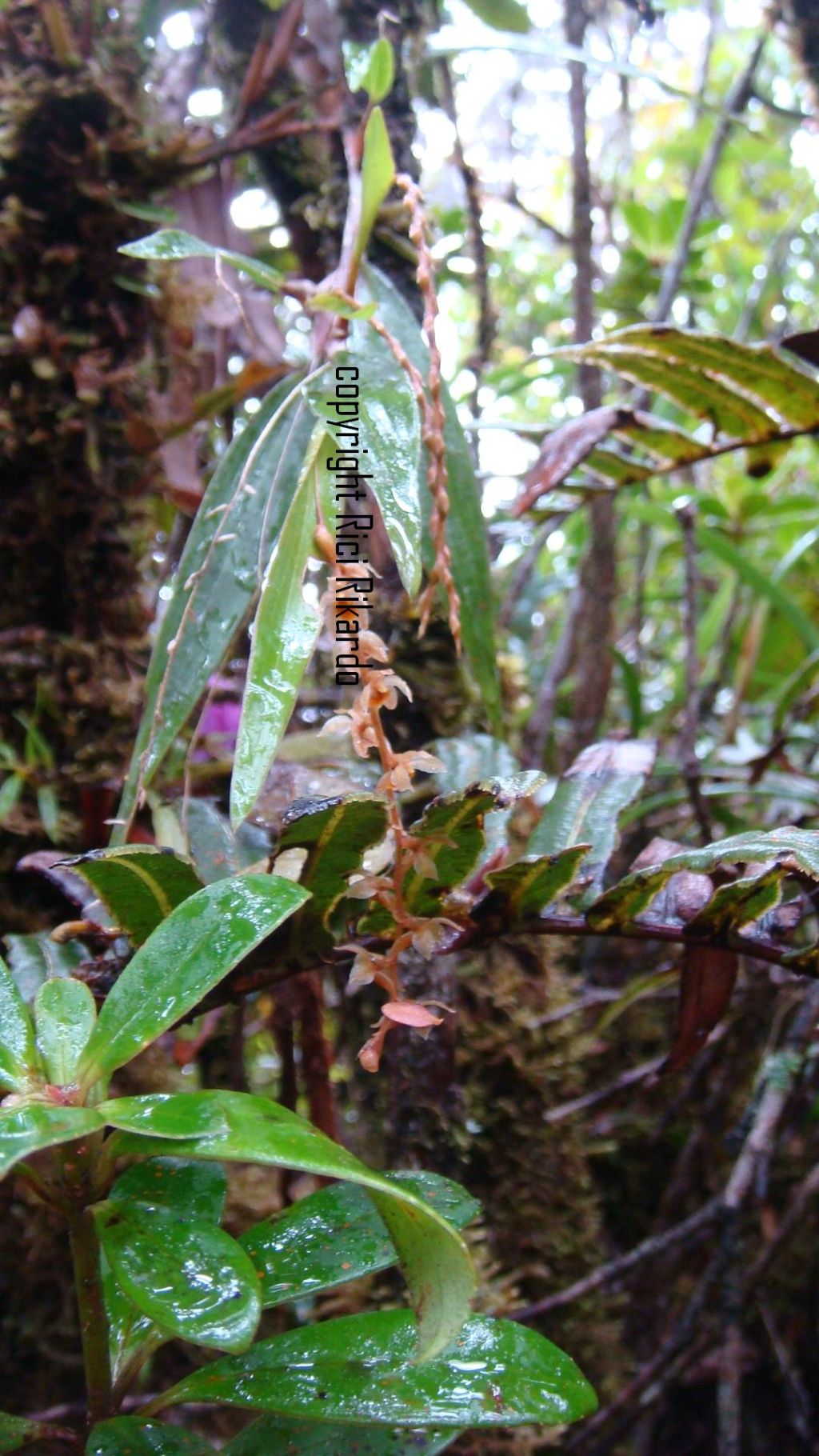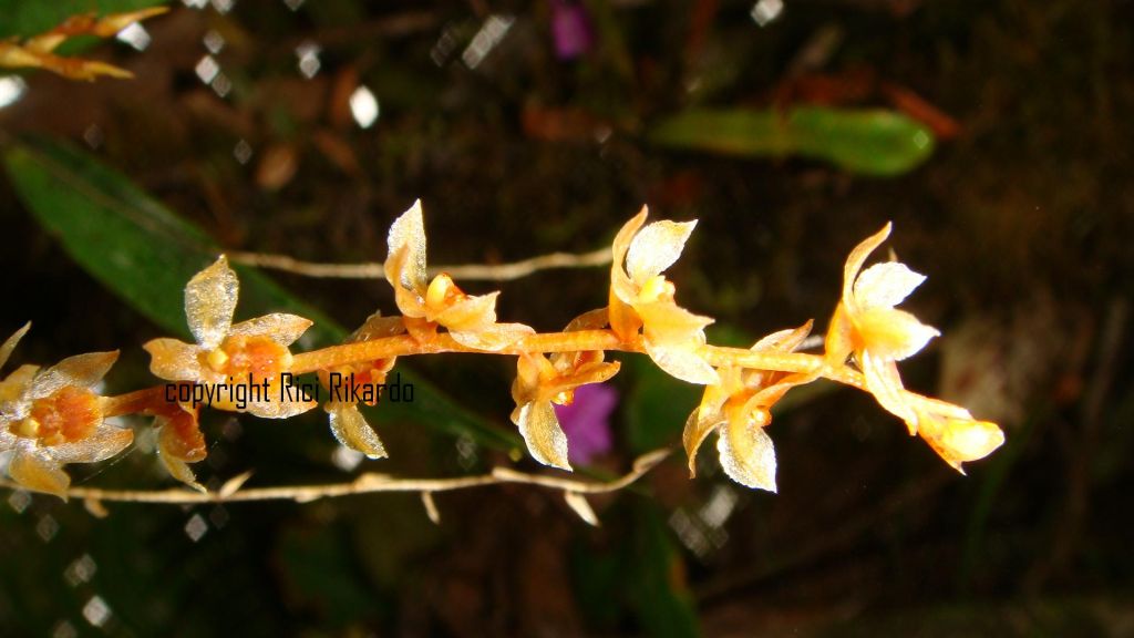 Found in Sumatra in montane forests at elevations around 1700 meters as a small sized, cool growing epiphyte with 1"+ between each terete, almost stem-like pseduobulb and carrying erect, linear-lanceolate, acute, tough, gradually narrowing below into the petiolate base leaves that blooms on a nodding, thin, red brown, 4.6" [11.5 cm] long, densely many flowered inflorescence arising from newly maturing pseudobulbs