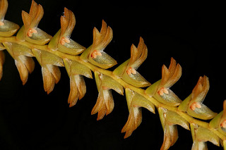 Found on Luzon in the Philippines in large clumps on mossy trees at elevations around 1600 to 2000 meters as a medium to large sized, cool growing epiphyte with slender, cylindric pseudobulbs carrying a single, apical, terete, slender leaves that blooms in the fall and winter on an apical, erect then arching, 8" [20 cm] long, wiry, densely many flowered inflorescence.