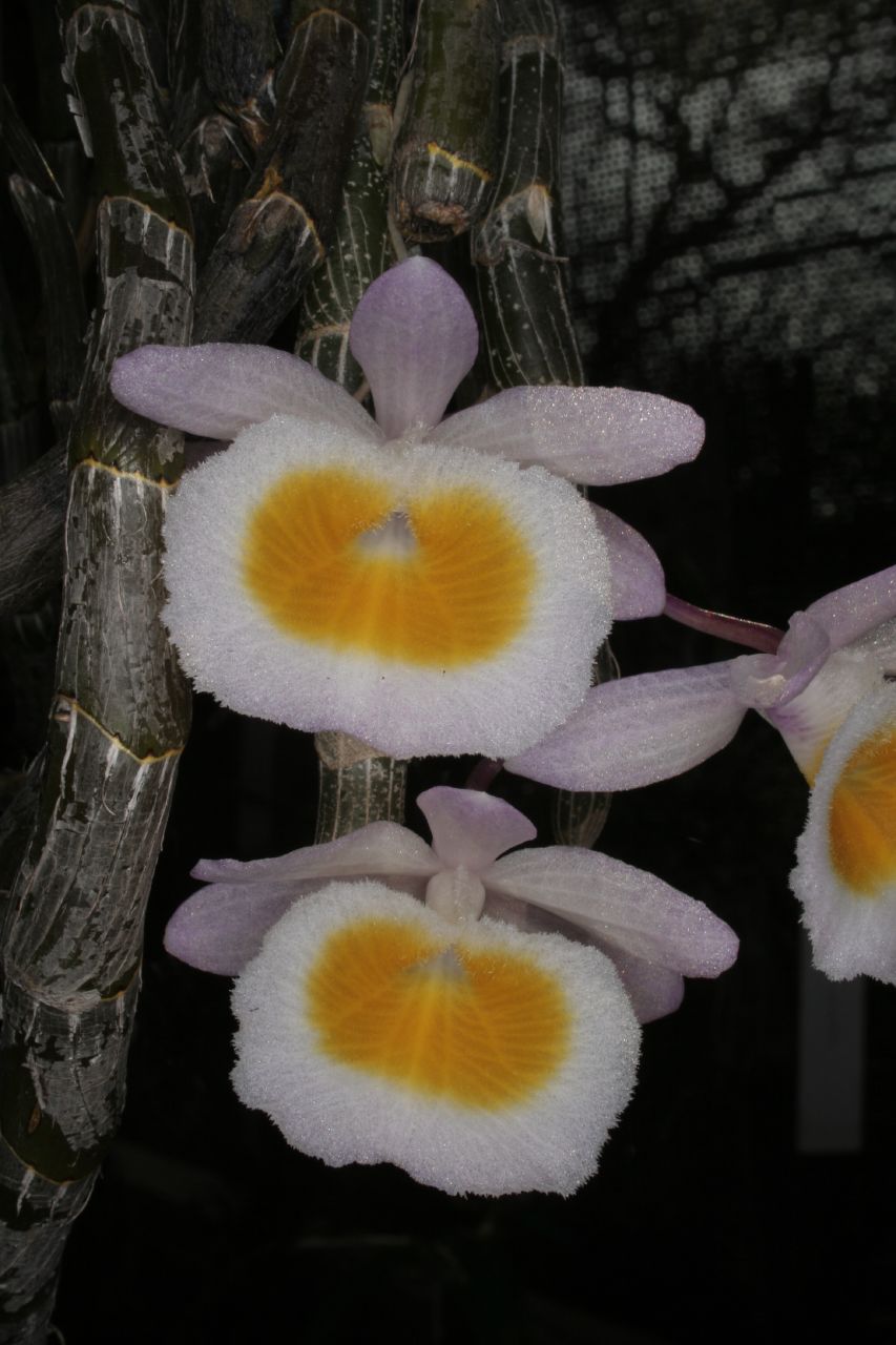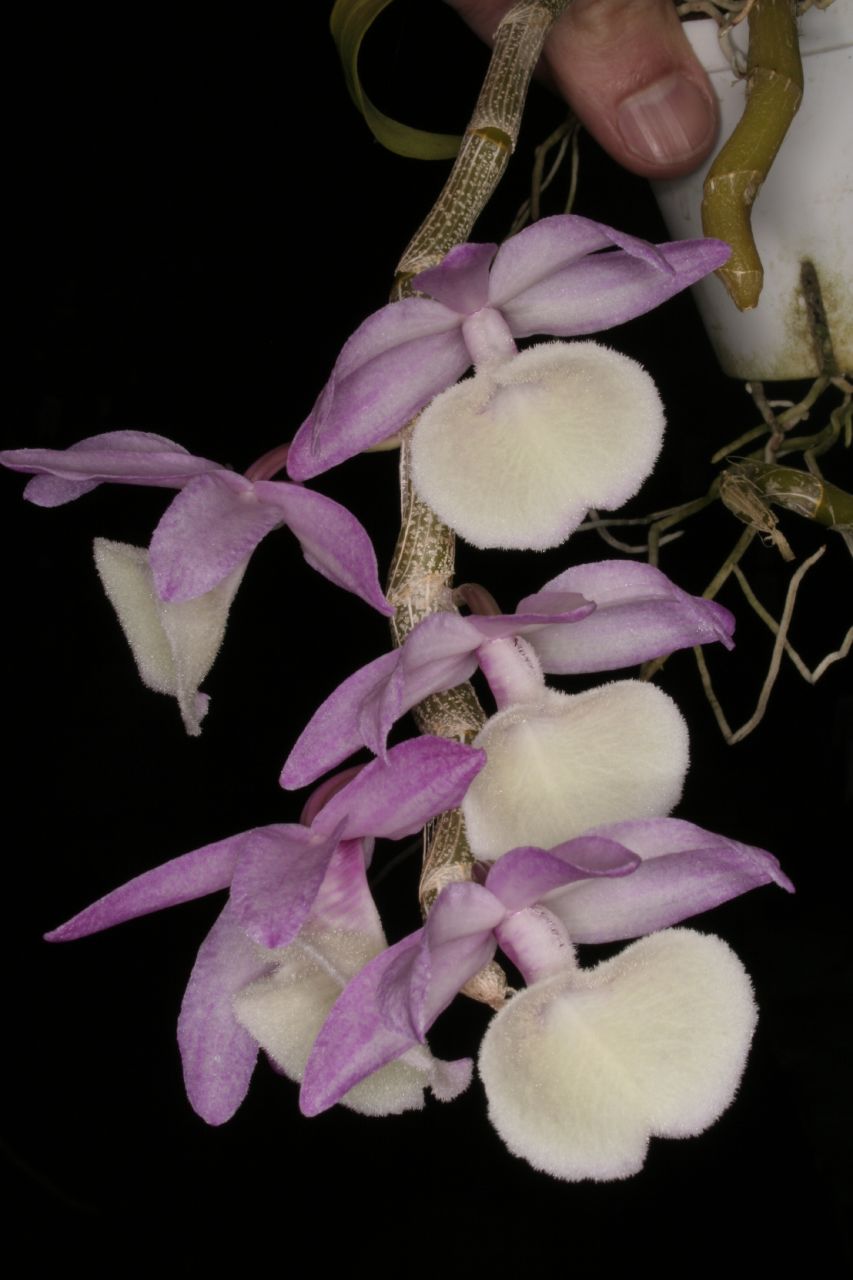 Found in Assam, eastern Himalayas, Nepal, western Himalayas, Andaman Islands, Myanmar, Thailand, Laos, Yunnan China and Vietnam as a large sized, warm growing, pendant epiphyte found on deciduous trees at elevations of 500 to 1000 meters where they need direct sunlight for at least 3 hours a day. This plant has clustered, ascending, prostrate or pendulous, terete, sulcate stems covered in white sheaths and blooms in the winter through summer on a short inflorescence with minute bracts and 1 to 2, fragrant flowers that arise from nodes along the leafless cane and needs lots of water and fertilizer after the new growth begins, lasting through late September when it is time to stop water and fertilizer until the new growths begin again.