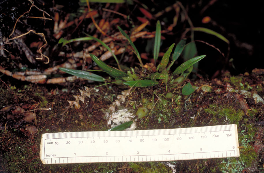Found in Sumatra in forests at elevations around 1525 meters as a mini-miniature sized, cool growing epiphyte with a short, branching rhizome giving rise to close set, ovoid pseudobulbs carrying a single, linear-lanceolate, acute, narrowing below into the grooved petiolate base leaf that blooms on a thin, peduncle to 2.2" [5.5 cm] long, arising on an almost mature pseudobulb, rachis sinuous, to 1.4" [3.5 cm] long, 15 top 17 flowered inflorescence carrying pale, flesh colored flowers.