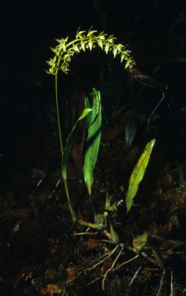 Found in penninsular Malaysia on exposed mountain ridges at elevations of 1350 to 2100 meters as a small sized, cool to cold growing epiphyte with stout unbranched roots arising from a rhizome free from the substrate and .6 to 1.2" [2 to 3 cm] between each pseudobulb and carrying a single, apical, elliptic, blunt, gradually narrowing below into the petiolate base leaf that blooms on a terminal, 12" [30 cm] long, many flowered inflorescence.