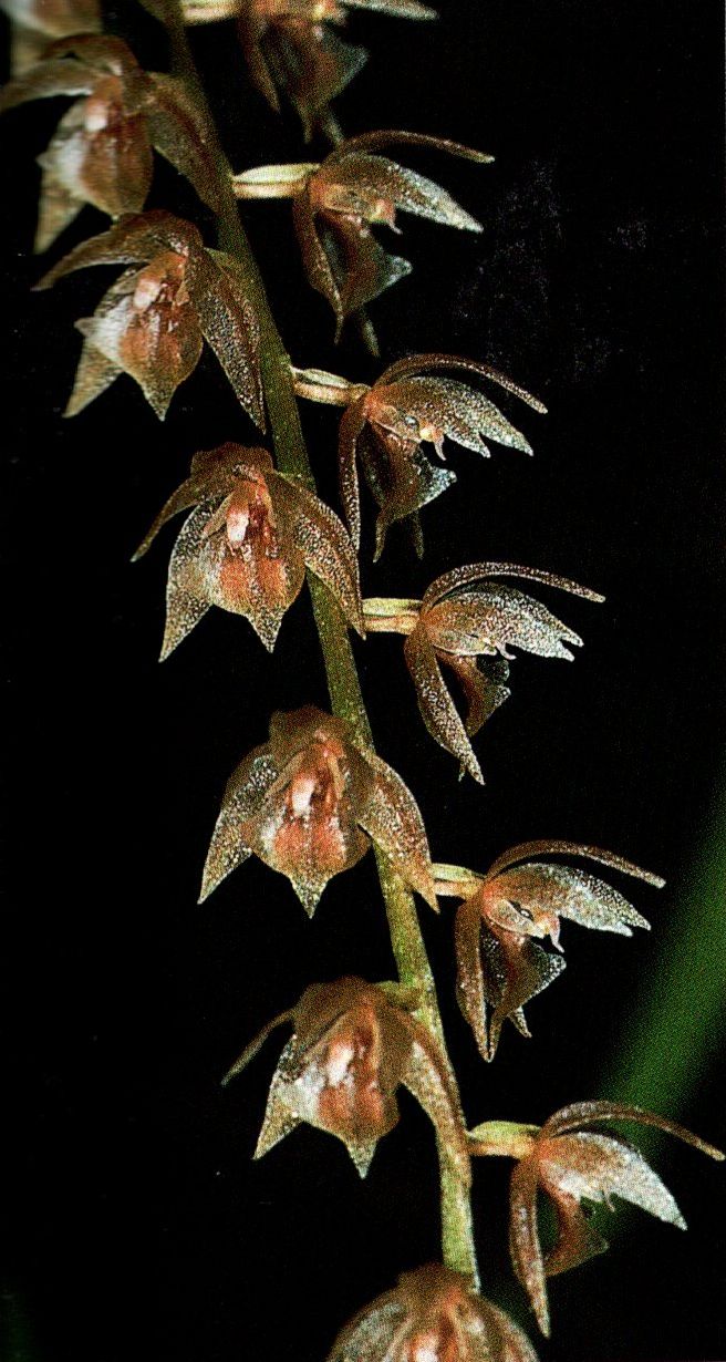 Found in northern Borneo in mossy forests at elevations of 900 to 2000 meters and in the var longicuspe 2000 to 2500 meters as a miniature sized, clump forming, warm to cool, and in the var longicuspum cold growing epiphyte with cylindrical to narrowly fusiform, erect pseudobulbs carrying a single, apical, coriaceous, 3 to 4 nerved, narrowly linear, subacute to acute, narrowing below into the petiolate base leaf that blooms at most any time of the year on an erect, gently curving, peduncle 1 to 2.6" [2.5 to 6.5 cm] long, without bracts, rachis quadrangular, 1.4 to 2.6" [3.5 to 6.5 cm] long, densely many flowered inflorescence with ovate, acute, longer than the ovary floral bracts.