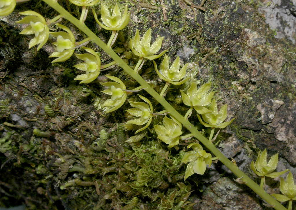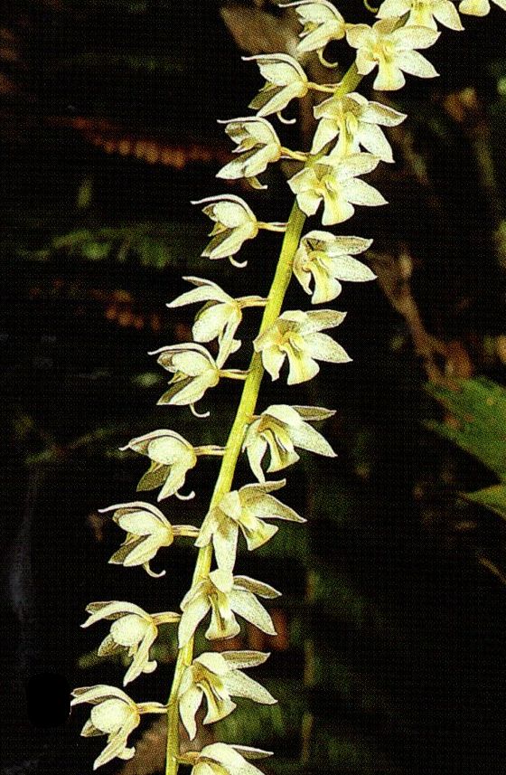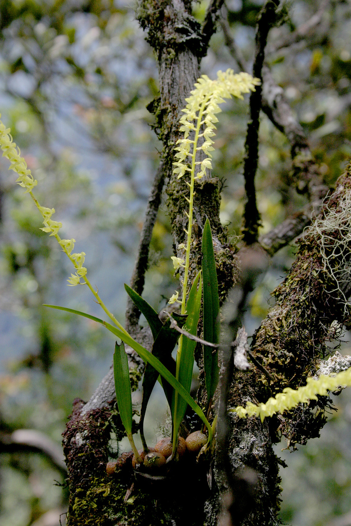 Found in Sumatra and northern and northwestern Borneo in lower to upper montane forests and scrub at elevations of 1400 to 3000 meters as a miniature to small sized, cool to cold growing epiphyte with close set, ovoid-oblong to globose-ovoid, smooth becoming wrinkled, yellowish to red pseudobulbs carrying a single, apical, erect, linear to oblong to oblong-elliptic, apex often conduplicate, obtuse and mucronate to acute, cuneate below into the rigid, sulcate, petiolate base leaf that blooms in the spring and fall on an erect to gently curving, arising with a new growth, often rather stout, quadrangular, 5.2 to 14.8" [13 to 37 cm] long, laxly to subdensely 10 to many flowered inflorescence without or with, 1 to 2, ovate, acuminate bracts and oblong-ovate to ovate-elliptic, obtuse to acuminate floral bracts and carrying strongly scented flowers.