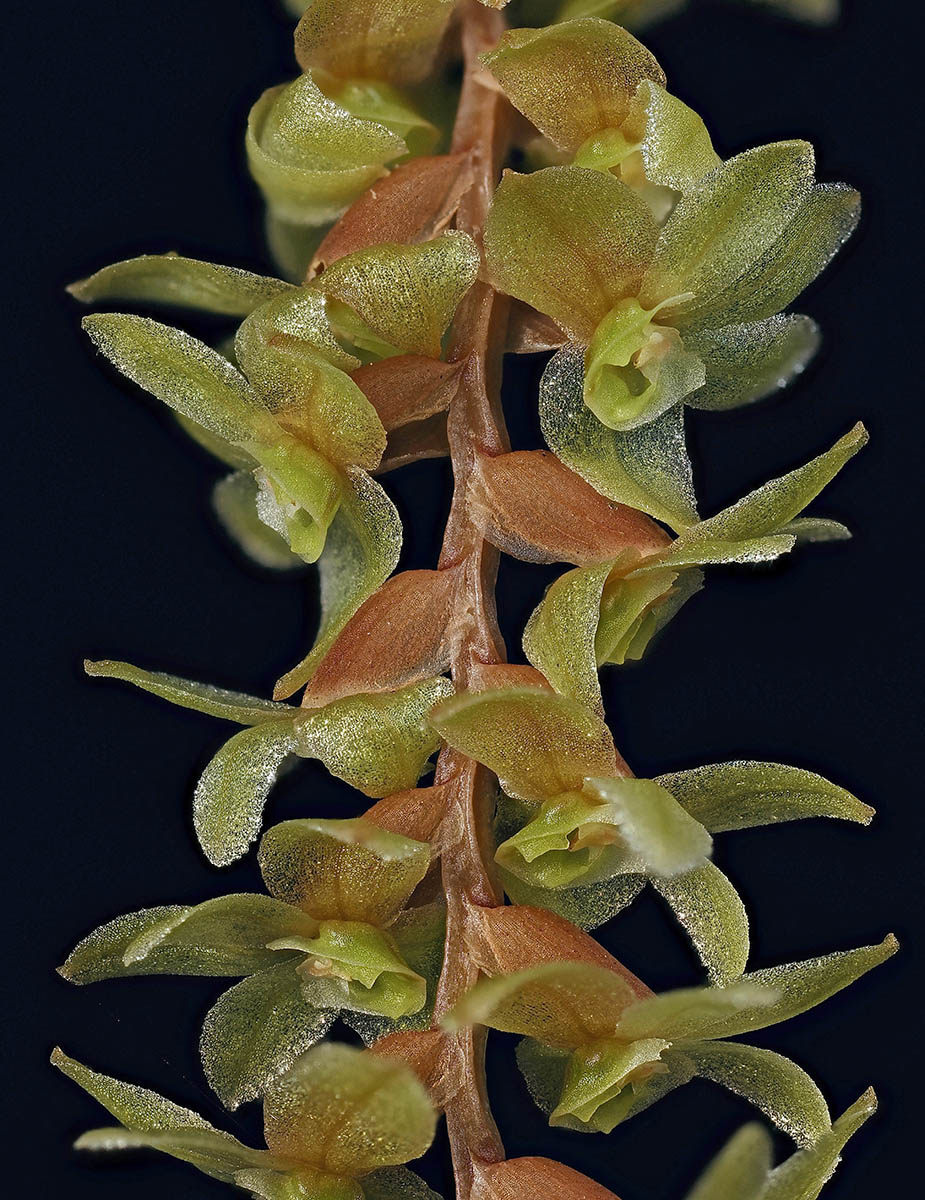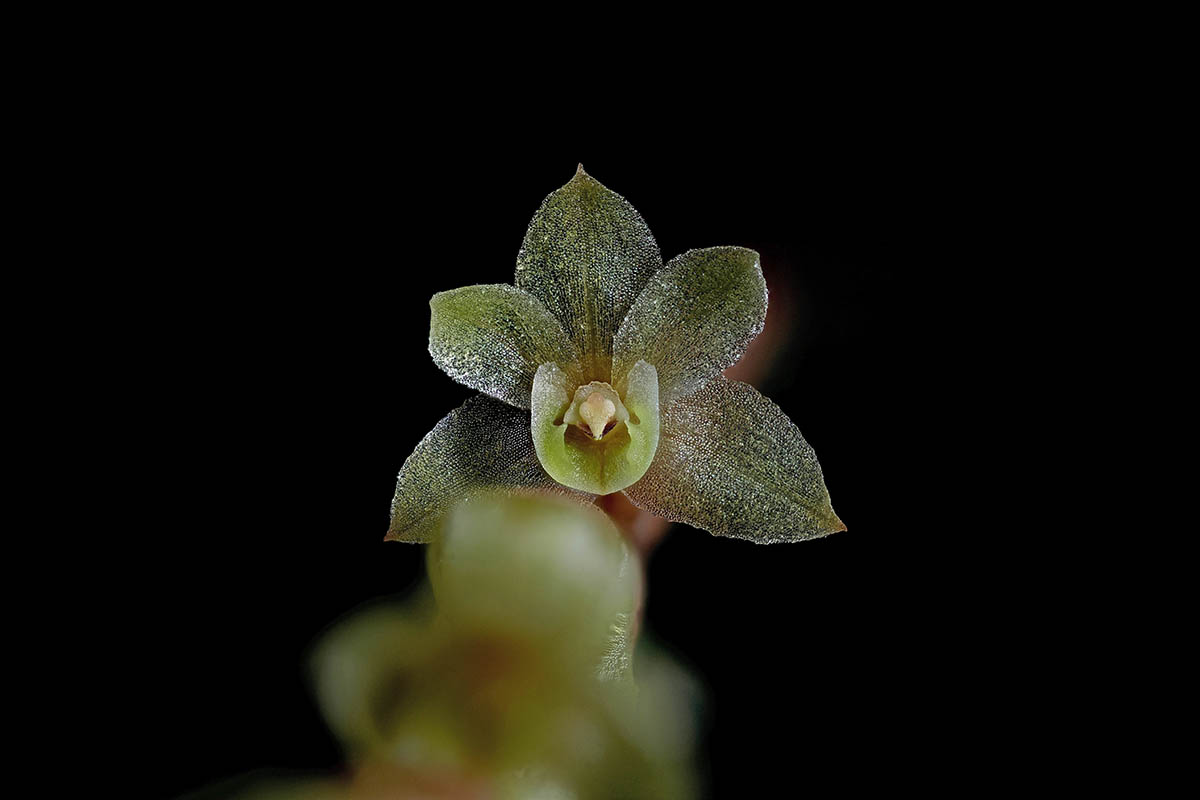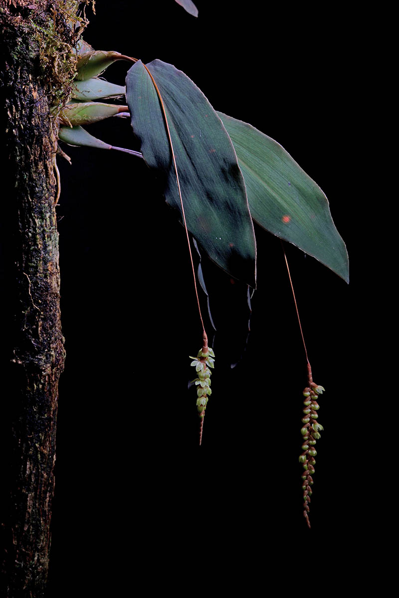 Found on Mindanao in the Philippines in shady Dipterocarp forests at elevations around 840 meters as a miniature sized, warm growing epiphyte with clustered, conical-ovate pseudobulbs enveloped by cataphyls and carrying a single, apical, velvety-glabrous, elliptic-lanceolate, acute, unequally rounded below into the brown, glabrous, petiolate base leaf that blooms in the later winter on an erect then pendent, synanthous, to 10 " [25 cm] long overall, rachis elongating, middle flowers open first, to 34 flowered inflorescence and carrying mildly fragrant flowers.