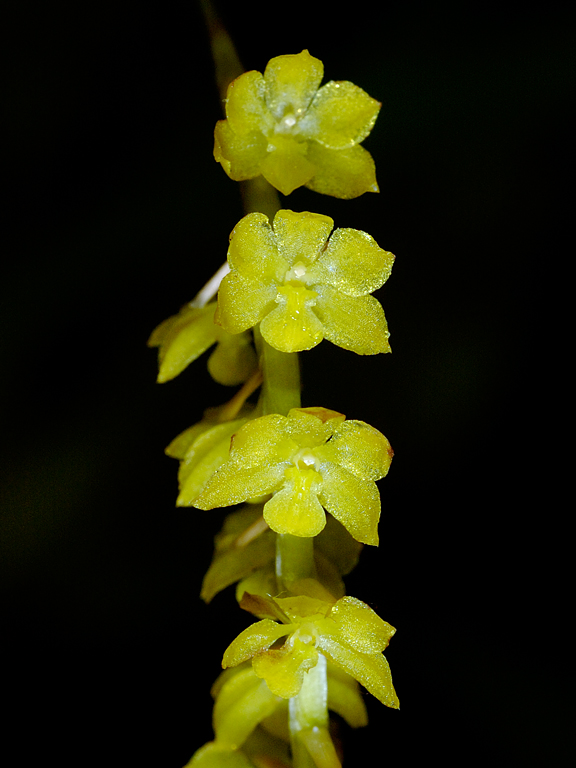 Found in the Philippines at elevations of 660 to 2250 meters as a miniature to small sized, warm to cold growing, miniature with conical or ellipsoid-fusiform pseudobulbs covered with papery sheaths carrying 2 apical, erect, petiolate, narrowly linear-ligulate, subobtuse leaves needing good light and even year round watering that blooms in the spring to early summer on a 24" [60 cm], pendulous-arcuate, slender, crowded, many flowered [100+], inflorescence arising from the apex of a newly developing pseudobulb and having papery, convolute bracts that are equal to the ovary in length. This species has highly fragrant flowers that are arranged in 2 rows.