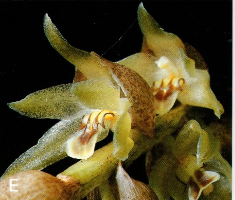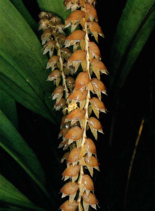 Found in Borneo in hill and lower montane forests at elevations of 900 to 1500 meters as a medium to large sized, warm to cool growing epiphyte with crowded, narrowly pyriform to cylindrical, smooth to finely straited pseuedobulbs carrying a single, apical, oblong-elliptic to elliptic, acute to acuminate, coriaceous, 7 to9 nerved, midvein raised on abaxial side, gradually narrowing below into the tough, slender, sulcate to canaliculate petiolate base leaf that blooms in the summer through fall on a porrect to arching then pendulous, quadrangular, 25.6" to 42.4" [64 to 106 cm] long, laxly to subdensely many flowered inflorescence with 3 to 4, ovate-elliptic, acute bracts and broadly ovate-elliptic, rounded, imbricate in immaturity, equal to exceeding the flowers, brown sometimes flushed pink floral bracts and carrying strongly sweet scented flowers