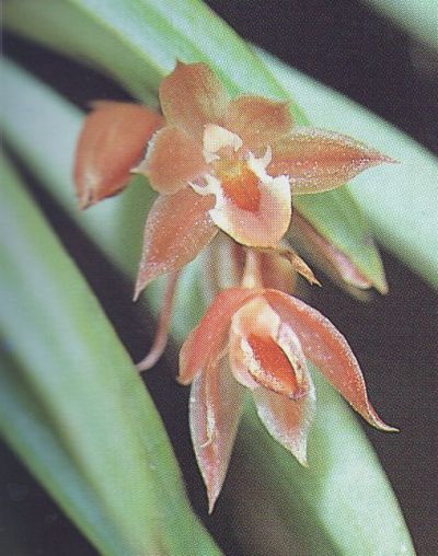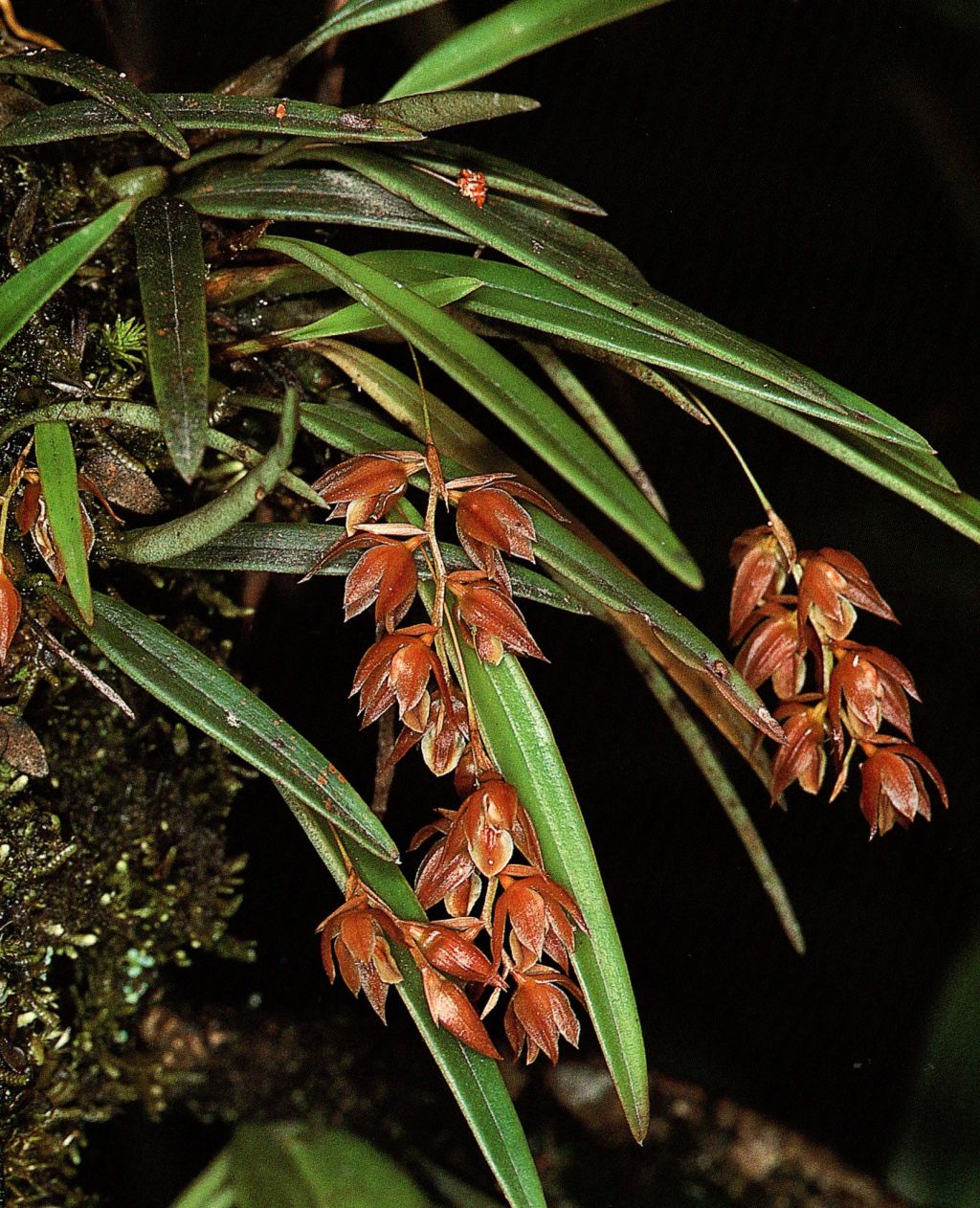 Found in Sabah & Sarawak Borneo in mixed hill, lower montane mossy forests on rocks and rocky roadside cuttings at elevations of 1300 to 2000 meters as a mini-miniature sized, cool growing lithophyte with an abbreviated rhizome giving rise to crowded clump forming, oblong-elliptic to narrowly fusiform pseudobulbs carrying a single, apical, thick, fleshy, sulcate above, curved, 3 nerved, narrowly linear-elliptic, acute, narrowing below into the sulcate petiolate base leaf that blooms in the summer on a pendulous, shorter than the leaves, peduncle filiform,.4 to 2.8" [1 to 7 cm] long, yellowish green, provided with 1 to 2, ovate-elliptic, acuminate bracts, rachis quadrangular, slightly fractiflex, salmon pink, .24 to .72" [.6 to 1.8 cm] long, laxly 3 to 5 flowered inflorescence with ovate, acuminate, brown, longer than the ovary floral bracts and carrying flowers with transluscent pink to salmon pink to pale brownish sepals with a darker red to brownish pinkmedian nerve, transluscent pink to salmon pink petals, a basally green lip with white side lobes, awhite to dull yellow mid lobe with the central area red to brownish red, a pink column and a whiote anther cap.