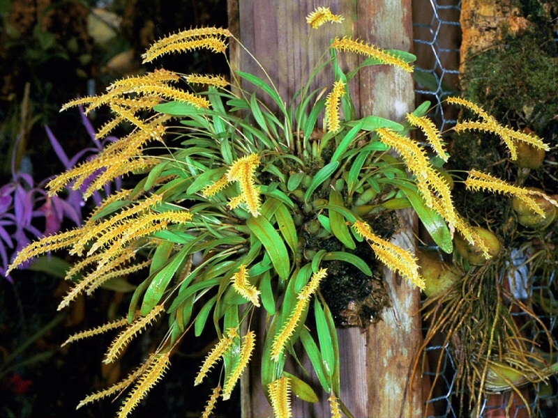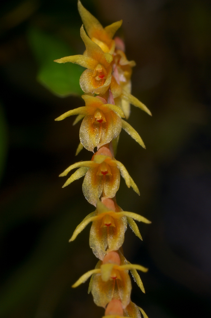 Found only in the Philippines on mossy trees in montane forests at elevations around 1200 meters as a miniature [4"] sized, cool growing epiphyte with oval pseudobulbs enveloped by tubular sheaths basally and carrying a single, apical, linear-oblong, 3 veined leaf and blooms in the winter, spring and summeron a semi-arching, 1 1/2" [3.75 cm] long, many [20] flowered, racemose, crowded inflorescence arising on a new growth.