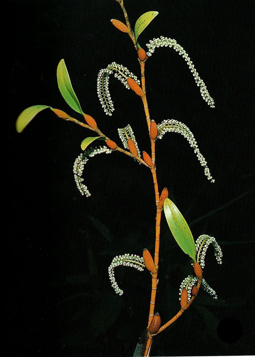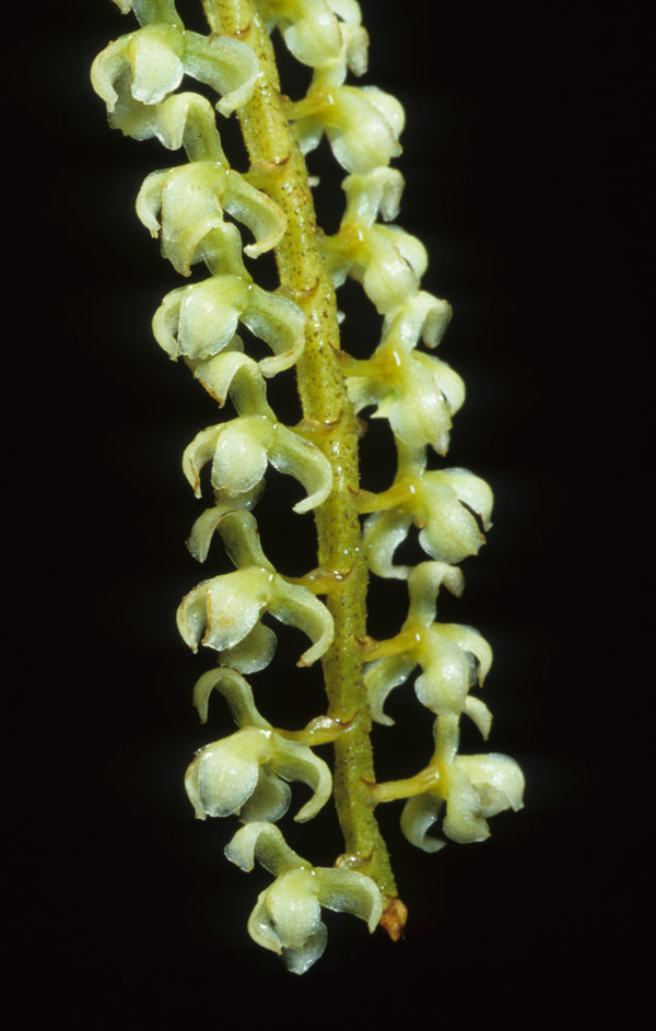 Found in penninsular Malaysia and Borneo in montane forests on in lower montane forests steep rocky roadside banks often in exposed locations at elevations of 400 to 1600 meters as a miniature sized, hot to coolgrowing epiphyte, terrestrial or lithophyte on sandstone and shale outcrops or epiphyte with cylindrical, riged, olive to orange pseudobulbs carrying a single, apical, elliptic or oblong elliptic, obtuse, minutely mucronate apically, coriaceous, gradually narrowing below into the clasping, petiolate base leaf and blooms in the summer on a from the rhizome, 7.2" [18 cm] long, densely many flowered, terete inflorescence enveloped almost completely by brown, furfuraceous, somewhat inflated bracts and carrying the sweetly scented flower in an arching spray.