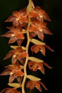 Found in Borneo in mixed forests at elevations around 200 to 300 meters as a small sized, hot growing epiphyte with crowded, ovoid-oblong pseudubulbs carrying a single, apical, erect, coriaceous, linear, ligulate, acute, slightly constricted towards the apex, thin textured, sulcate below into the petiolate base leaf that blooms in the winter in cultivation on an curving to pendulous, peduncle 6 to 6.4" [15 to 16 cm] long, filiform, rachis 1.2 to 2" [3 to 5 cm] long, quadrangular, laxly 8 to 22 flowered inflorescence with oblong-elliptic to oblong-ovate, apiculate, longer tha the ovary floral bracts.