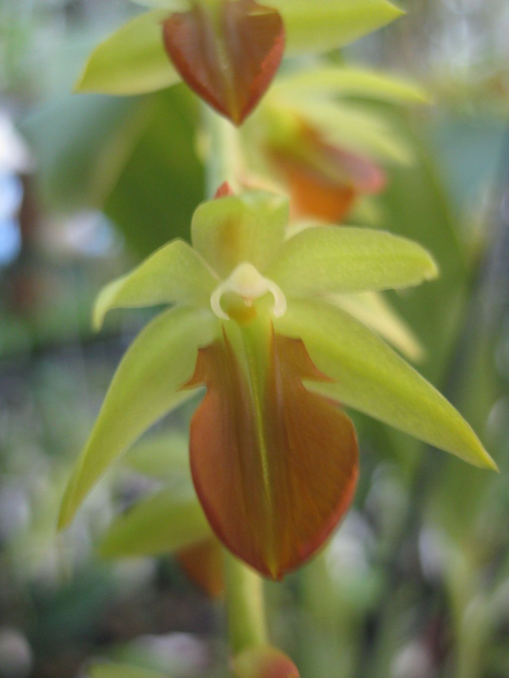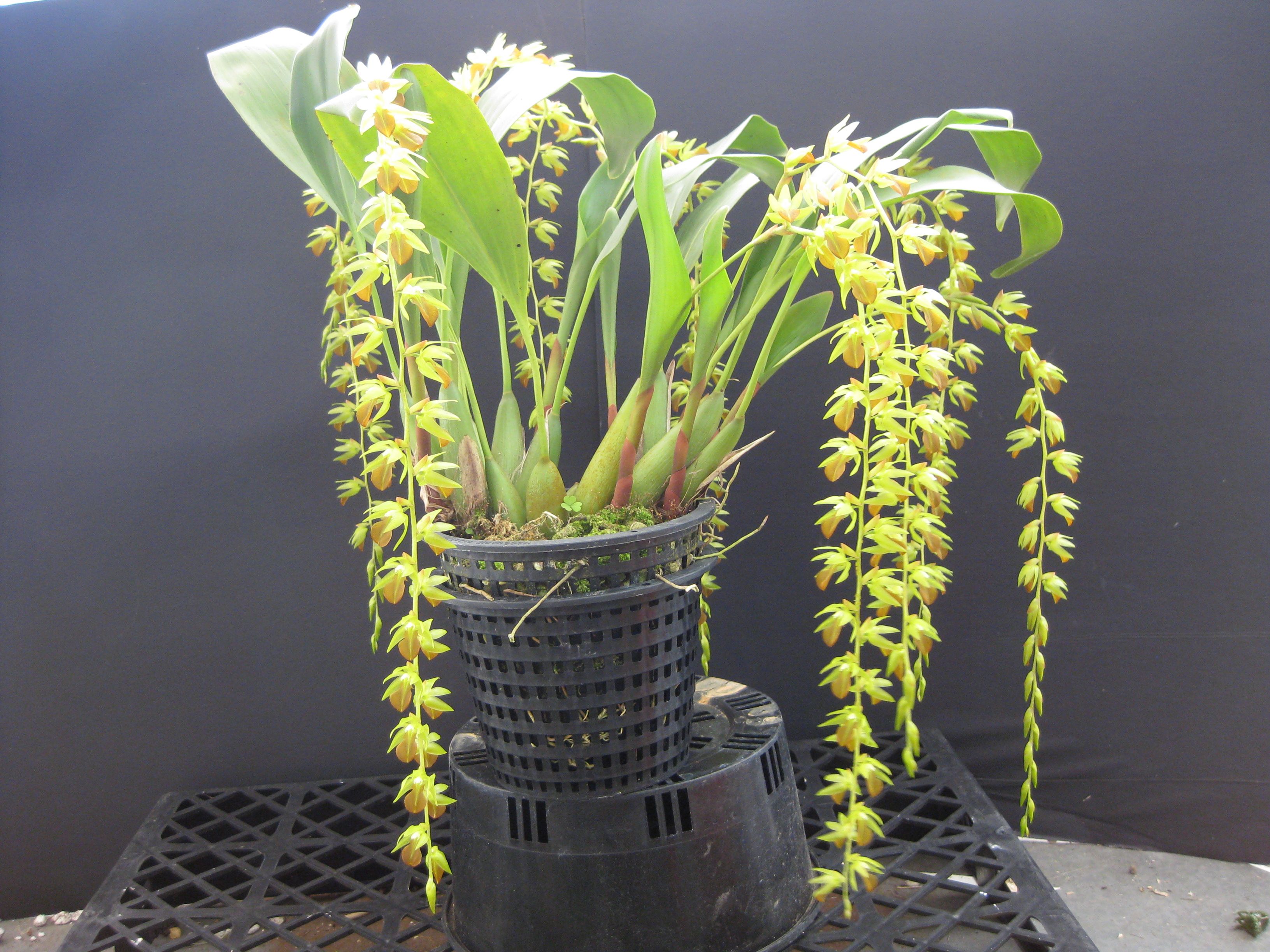 Found in Sulawesi at elevations of 1000 to 1400 meters as a medium sized, cool growing epiphyte with more or less clustered, whitish green to mid green, fusiform, thickest below the middle, often curved pseudobulbs carrying a single, apical, erect, oblanceolate, convolute, acute to obtuse, 7 to 9 distinct nerved, narrowling below intothe channeled, petiolate base leaf that blooms in the spring on n erect then arching, synanthous, racemose, slender, terete, subglabrous, 6 to 15.1" [15 to 37.6 cm] long, lax, 20 to many flowered inflorescence with persistent, glumaceous, ellipsoid, acute to acuminate, many veined, finely setose floral bracts and carrying resupinate, nodding, fragrant flowers