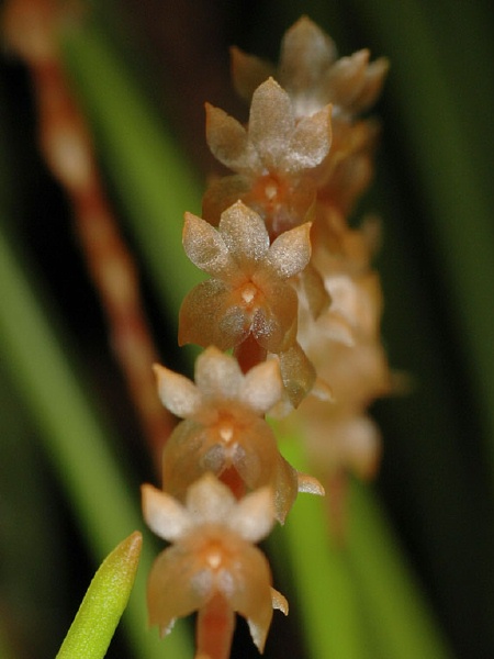Endemic to the high mountains of Luzon, the Philippines in mossy forests at elevations of 1200 to 2300 meters as a small sized, cool growing epiphyte on moss covered branches with very small to almost non-existent pseudobulbs carrying grass-like, thick and flattened leaves and blooms in the winter on an arcuate, 2" [5 cm] long, many [25] flowered inflorescence that arises with a new growth.