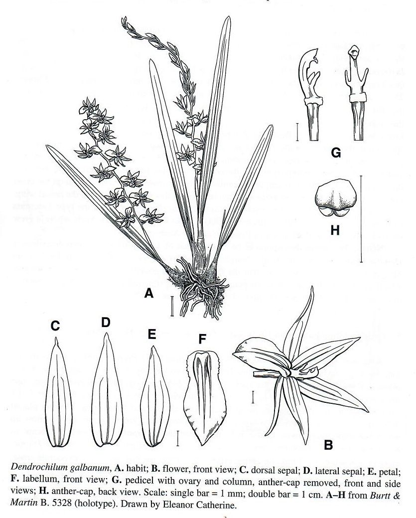 Dendrochilum galbanum J.J.Wood 1994 SUBGENUS Platyclinis SECTION Platyclinis [Benth.] Pfitzer Drawing by Eleanor Catherine
