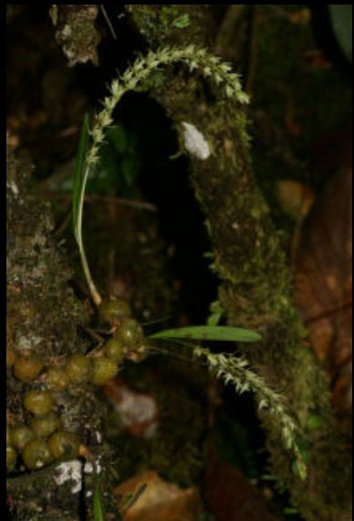 Found in Sabah and Sarawak Borneo in in hill and lower montane forests at elevations of 700 to 900 meters as a mini-miniature sized, cool growing epiphyte or lithophyte with crowded, globose, ovoid to oblong-ovoid , obtuse pseudobulbs carrying a single, apical, erect, narrowly elliptic, sometimes constricted below the apex, obtuse, thin textured, 5 nerved, sulcate and narrrowing below into the petiolate base leaf that blooms in the spring on an erect then gently curving, peduncle filiform, 1.4 to 4" [3.5 to 10 cm] long, rachis quadrangular, .8 to 2" [2 to 5 cm] long, pale orange, laxly 8 to 20 flowered inflorescence with a solitary oblong-ovate acute bract and oblong-ovate acute, apiculate to obtuse, floral bracts carrying sweetly scented flowers.