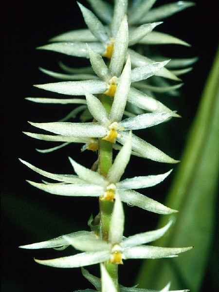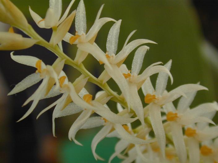 A Philippine epiphytic or lithophytic, small to medium sized, warm to cold growing species found at elevations of 500 to 2300 meters on trees and rocks with conical to ovoid, clustered pseudobulbs carrying a single, apical, grass-like, erect to narrowly elliptic or oblanceolate, plicate, acute or acuminate, longly petiolate leaves that blooms in the late winter, spring summer and fall on an axillary, to 12" [30 cm]long, slender, pendulous-arcuate, inflorescence with with spreading. imbricating, distichous, glumaceous bracts and many fragrant flowers arranged in 2 rows, smelling of sweet hay to curry, and all occupying the apical half.