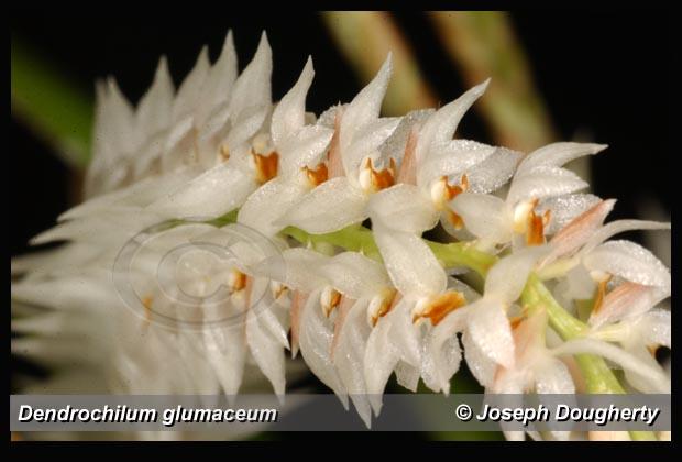 References W3 Tropicos, Kew Monocot list , IPNI ; Studies in the Family Orchidaceae Vol 1 Ames 1905 as Platyclinis glumaceum; S tudies in the Family Orchidaceae Vol 2 Ames 1908 drawing good; Studies in the Family Orchidaceae Vol 2 Ames 1908 as D glumaceum var validum drawing ok; Studies in the Family Orchidaceae Vol 5 Ames 1915; Die Orchideen Schlechter 1915 photo ok; Atlas des Orchidees Cultivees Constantin 1920 drawing ok; AOS Bulletin Vol 27 # 9 1958 as Platyclinis glumacea drawing fide; AOS Bulletin Vol 33 No 5 1964; Encyclopedia of Cultivated Orchids Hawkes 1965 photo ok; AOS Bulletin Vol 37 # 6 1968; The Complete Writings on Philippine Orchids Vol 1 Quisumbing 1981; The Complete Writings on Philippine Orchids Vol 2 Quisumbing 1981 photo ok; Die Orchideen 3 Auflage Bd 1 Sonderabdruck aus Schlechter Lieferung 15 881 - 944 Brieger, Maatsch and Senghas 1984 photo fide; Orchidiana Philipiniana Vol 1 Valmayor 1984; Orchidiana Philipiniana Vol 1 Valmayor 1984 D glumaceum var validum; AOS Bulletin Vol 56 No 9 1987 photo good; The Manual Of Cultivated Orchid Species Bechtel, Cribb & Launert 1992 photo fide; Orchid Digest Vol 59 No 1 1995 photo fide; AOS Bulletin Vol 66 No 8 1997 photo fide; Dendrochilum of Borneo Wood 2001 drawingfide/photo good; The Orchids of The Philippines Cootes 2001 photo fide; Flora Malesiana Orchids of the Philippines Vol I Agoo, Shuiteman and de Vogel 2003; AOS Bulletin vol 78 No 12 2009 photo fide; Philippine Native Orchid Species Cootes 2011 photo fide; Orchid Digest Vol 80 #2 2016; AOS Bulletin Vol 88 #3 2019 photo ok;