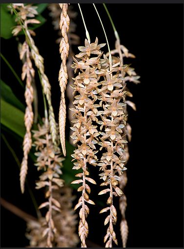 Found on Mindanao within the Philippines on mossy trees at elevations around 1800 to 2000 meters as a small sized, cool growing epiphyte with spindle-shaped pseudobulbs enveloped by, closely appressed, black dotted sheaths and carrying a single, apical, linear, narrow, tapering at both ends, obtuse, petiolate base leaf , that blooms in the late winter, spring and summer on threadlike, rachis to 1.8" [4.5 cm] long, 6" [15 cm] long overall, densely many flowered inflorescence.