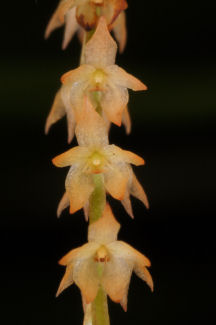 Found on Mindoro within the Philippines in dense mossy thickets at elevations around 2500 to 2600 meters as a small sized, cold growing epiphyte with elongate, thin pseudobulbs carrying a single, apical, oblong-lanceolate, obtuse, petiolate base leaf that blooms in the fall on new arising growths, to 3.6" [9 cm] long, many flowered inflorescence.